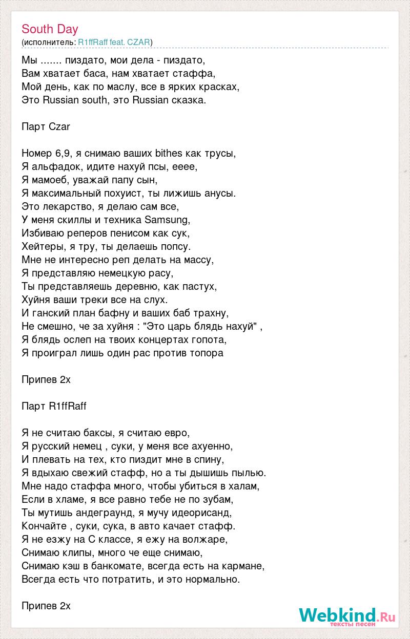 Мы ....... пиздато, мои дела - пиздато, Вам хватает баса, нам хватает стаффа, Мой день, как по маслу, все в ярких красках, Это Russian south, это Russian сказка. Парт Czar Номер 6,9, я снимаю ваших bithes как трусы, Я альфадок, идите нахуй псы, ееее, Я мамоеб, уважай папу сын, Я максимальный похуист, ты лижишь анусы. Это лекарство, я делаю сам все, У меня скиллы и техника Samsung, Избиваю реперов пенисом как сук, Хейтеры, я тру, ты делаешь попсу. Мне не интересно реп делать на массу, Я представляю немецкую расу, Ты представляешь деревню, как пастух, Хуйня ваши треки все на слух. И ганский план бафну и ваших баб трахну, Не смешно, че за хуйня : "Это царь блядь нахуй" , Я блядь ослеп на твоих концертах гопота, Я проиграл лишь один рас против топора Припев 2х Парт R1ffRaff Я не считаю баксы, я считаю евро, Я русский немец , суки, у меня все ахуенно, И плевать на тех, кто пиздит мне в спину, Я вдыхаю свежий стафф, но а ты дышишь пылью. Мне надо стаффа много, чтобы убиться в халам, Если в хламе, я все равно тебе не по зубам, Ты мутишь андеграунд, я мучу идеорисанд, Кончайте , суки, сука, в авто качает стафф. Я не езжу на С классе, я ежу на волжаре, Снимаю клипы, много че еще снимаю, Снимаю кэш в банкомате, всегда есть на кармане, Всегда есть что потратить, и это нормально. Припев 2х