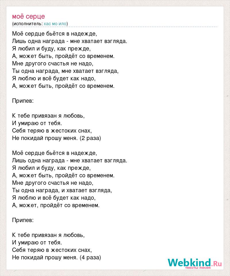 Моё сердце бьётся в надежде, Лишь одна награда - мне хватает взгляда. Я любил и буду, как прежде, А, может быть, пройдёт со временем. Мне другого счастья не надо, Ты одна награда, мне хватает взгляда, Я люблю и всё будет как надо, А, может быть, пройдёт со временем. Припев: К тебе привязан я любовь, И умираю от тебя. Себя теряю в жестоких снах, Не покидай прошу меня. (2 раза) Моё сердце бьётся в надежде, Лишь одна награда - мне хватает взгляда. Я любил и буду, как прежде, А, может быть, пройдёт со временем. Мне другого счастья не надо, Ты одна награда, и хватает взгляда, Я люблю и всё будет как надо, А, может, пройдёт со временем. Припев: К тебе привязан я любовь, И умираю от тебя. Себя теряю в жестоких снах, Не покидай прошу меня. (4 раза)