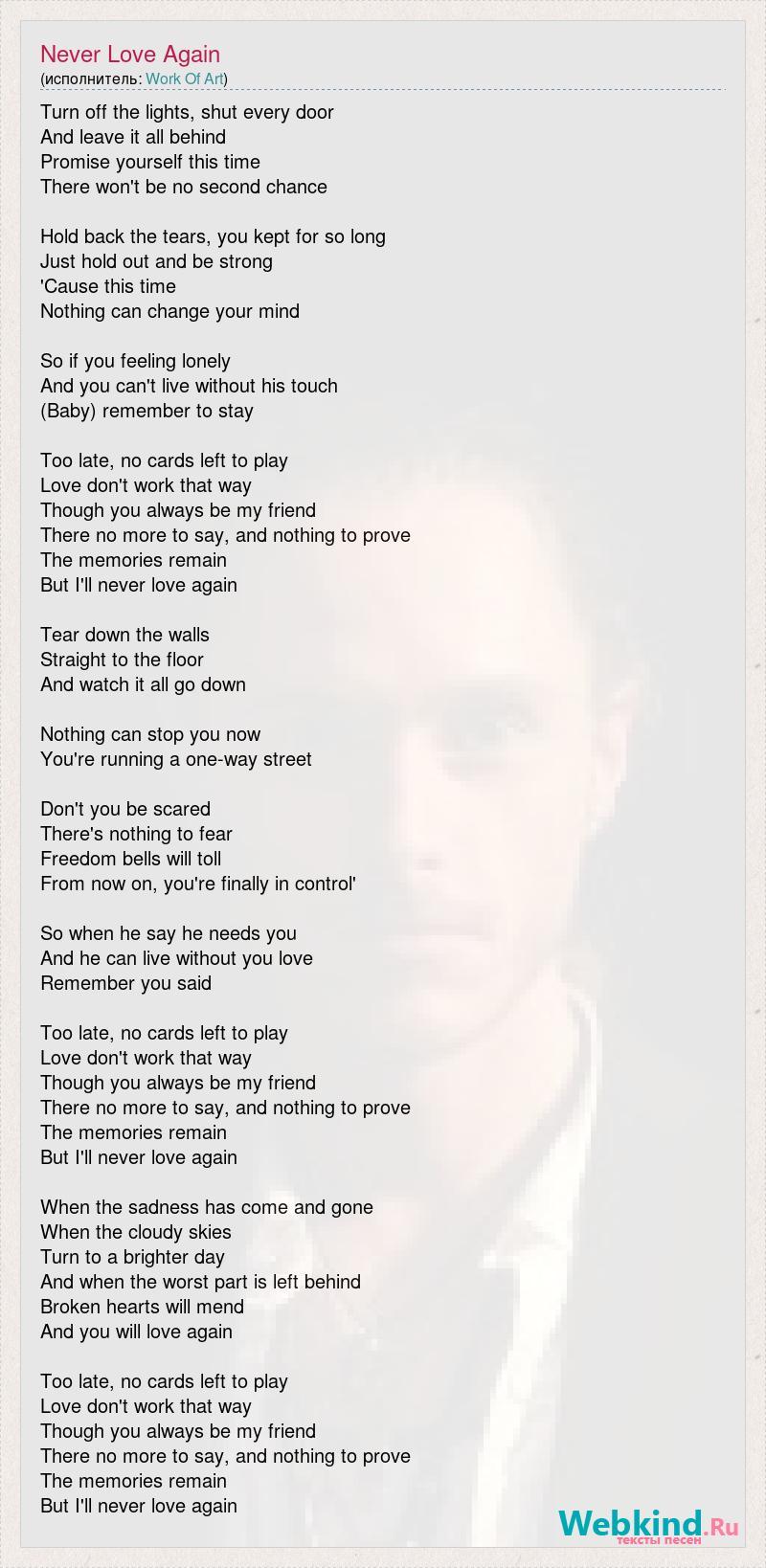 Turn off the lights, shut every door And leave it all behind Promise yourself this time There won't be no second chance Hold back the tears, you kept for so long Just hold out and be strong 'Cause this time Nothing can change your mind So if you feeling lonely And you can't live without his touch (Baby) remember to stay Too late, no cards left to play Love don't work that way Though you always be my friend There no more to say, and nothing to prove The memories remain But I'll never love again Tear down the walls Straight to the floor And watch it all go down Nothing can stop you now You're running a one-way street Don't you be scared There's nothing to fear Freedom bells will toll From now on, you're finally in control' So when he say he needs you And he can live without you love Remember you said Too late, no cards left to play Love don't work that way Though you always be my friend There no more to say, and nothing to prove The memories remain But I'll never love again When the sadness has come and gone When the cloudy skies Turn to a brighter day And when the worst part is left behind Broken hearts will mend And you will love again Too late, no cards left to play Love don't work that way Though you always be my friend There no more to say, and nothing to prove The memories remain But I'll never love again