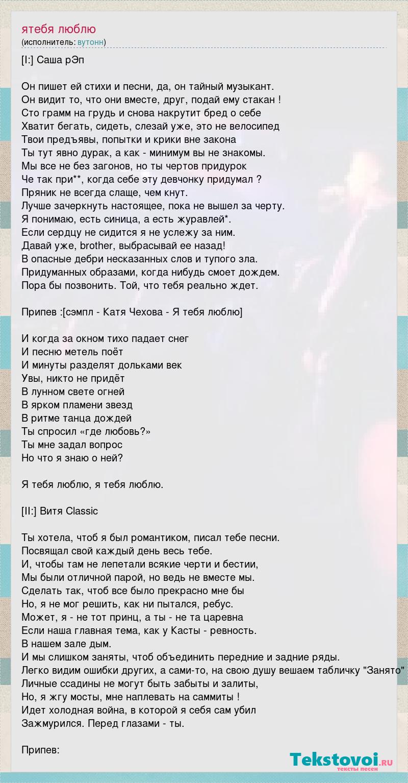 [I:] Саша рЭп Он пишет ей стихи и песни, да, он тайный музыкант. Он видит то, что они вместе, друг, подай ему стакан ! Сто грамм на грудь и снова накрутит бред о себе Хватит бегать, сидеть, слезай уже, это не велосипед Твои предъявы, попытки и крики вне закона Ты тут явно дурак, а как - минимум вы не знакомы. Мы все не без загонов, но ты чертов придурок Че так при**, когда себе эту девчонку придумал ? Пряник не всегда слаще, чем кнут. Лучше зачеркнуть настоящее, пока не вышел за черту. Я понимаю, есть синица, а есть журавлей*. Если сердцу не сидится я не услежу за ним. Давай уже, brother, выбрасывай ее назад! В опасные дебри несказанных слов и тупого зла. Придуманных образами, когда нибудь смоет дождем. Пора бы позвонить. Той, что тебя реально ждет. Припев :[сэмпл - Катя Чехова - Я тебя люблю] И когда за окном тихо падает снег И песню метель поёт И минуты разделят дольками век Увы, никто не придёт В лунном свете огней В ярком пламени звезд В ритме танца дождей Ты спросил «где любовь?» Ты мне задал вопрос Но что я знаю о ней? Я тебя люблю, я тебя люблю. [II:] Витя Classic Ты хотела, чтоб я был романтиком, писал тебе песни. Посвящал свой каждый день весь тебе. И, чтобы там не лепетали всякие черти и бестии, Мы были отличной парой, но ведь не вместе мы. Сделать так, чтоб все было прекрасно мне бы Но, я не мог решить, как ни пытался, ребус. Может, я - не тот принц, а ты - не та царевна Если наша главная тема, как у Касты - ревность. В нашем зале дым. И мы слишком заняты, чтоб объединить передние и задние ряды. Легко видим ошибки других, а сами-то, на свою душу вешаем табличку "Занято" Личные ссадины не могут быть забыты и залиты, Но, я жгу мосты, мне наплевать на саммиты ! Идет холодная война, в которой я себя сам убил Зажмурился. Перед глазами - ты. Припев: