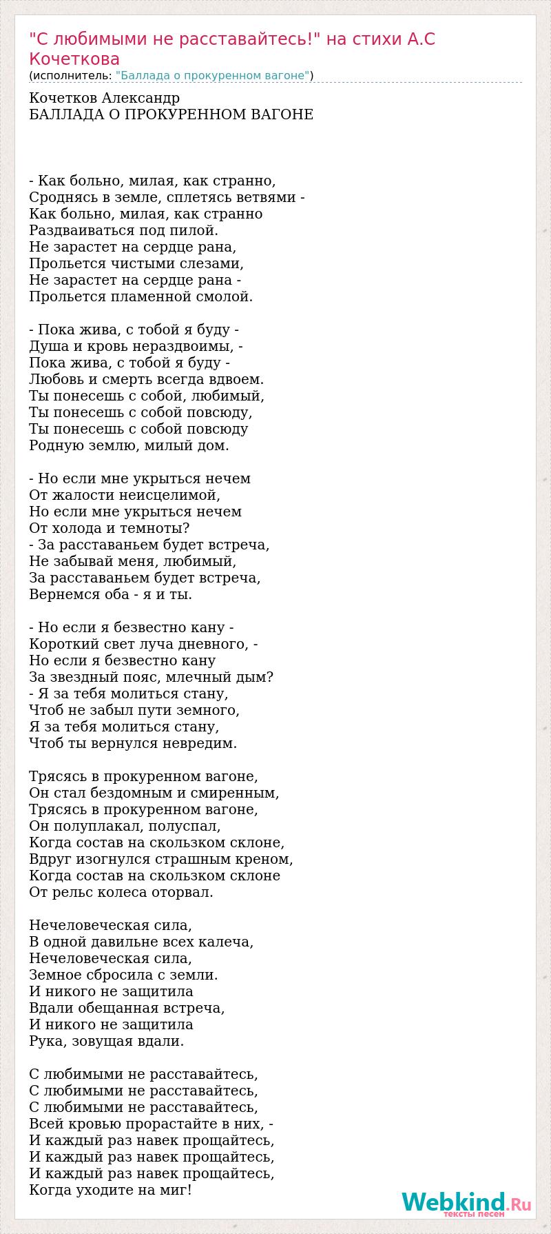 Главная→Исполнители→"Баллада о прокуренном вагоне"→"С любимыми не расставайтесь!" на стихи А.С Кочеткова