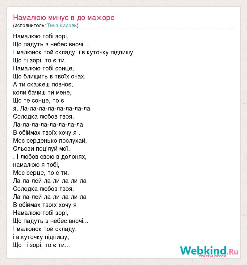 Намалюю тобі зорі, Що падуть з небес вночі... І малюнок той складу, і в куточку підпишу, Що ті зорі, то є ти. Намалюю тобі сонце, Що блищить в твоїх очах. А ти скажеш повноє, коли бачиш ти мене, Що те сонце, то є я. Ла-ла-ла-ла-ла-ла-ла-ла Солодка любов твоя. Ла-ла-ла-ла-ла-ла-ла-ла В обіймах твоїх хочу я . Моє серденько послухай, Сльози поцілуй мої.. . І любов свою в долонях, намалюю я тобі, Моє серце, то є ти. Ла-ла-лей-ла-ли-ла-ли-ла Солодка любов твоя. Ла-ла-лей-ла-ли-ла-ли-ла В обіймах твоїх хочу я Намалюю тобі зорі, Що падуть з небес вночі... І малюнок той складу, і в куточку підпишу, Що ті зорі, то є ти...