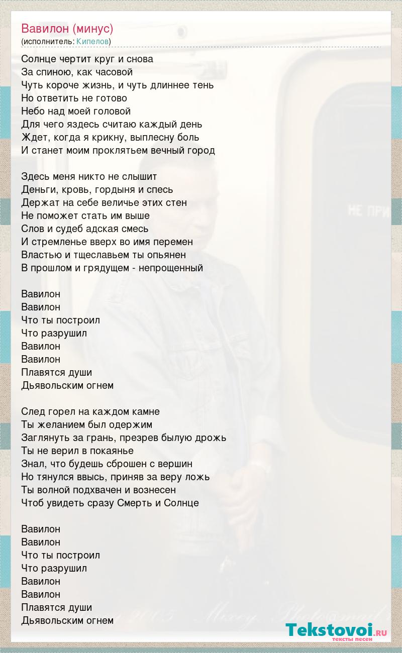 Солнце чертит круг и снова За спиною, как часовой Чуть короче жизнь, и чуть длиннее тень Но ответить не готово Небо над моей головой Для чего яздесь считаю каждый день Ждет, когда я крикну, выплесну боль И станет моим проклятьем вечный город Здесь меня никто не слышит Деньги, кровь, гордыня и спесь Держат на себе величье этих стен Не поможет стать им выше Слов и судеб адская смесь И стремленье вверх во имя перемен Властью и тщеславьем ты опьянен В прошлом и грядущем - непрощенный Вавилон Вавилон Что ты построил Что разрушил Вавилон Вавилон Плавятся души Дьявольским огнем След горел на каждом камне Ты желанием был одержим Заглянуть за грань, презрев былую дрожь Ты не верил в покаянье Знал, что будешь сброшен с вершин Но тянулся ввысь, приняв за веру ложь Ты волной подхвачен и вознесен Чтоб увидеть сразу Смерть и Солнце Вавилон Вавилон Что ты построил Что разрушил Вавилон Вавилон Плавятся души Дьявольским огнем