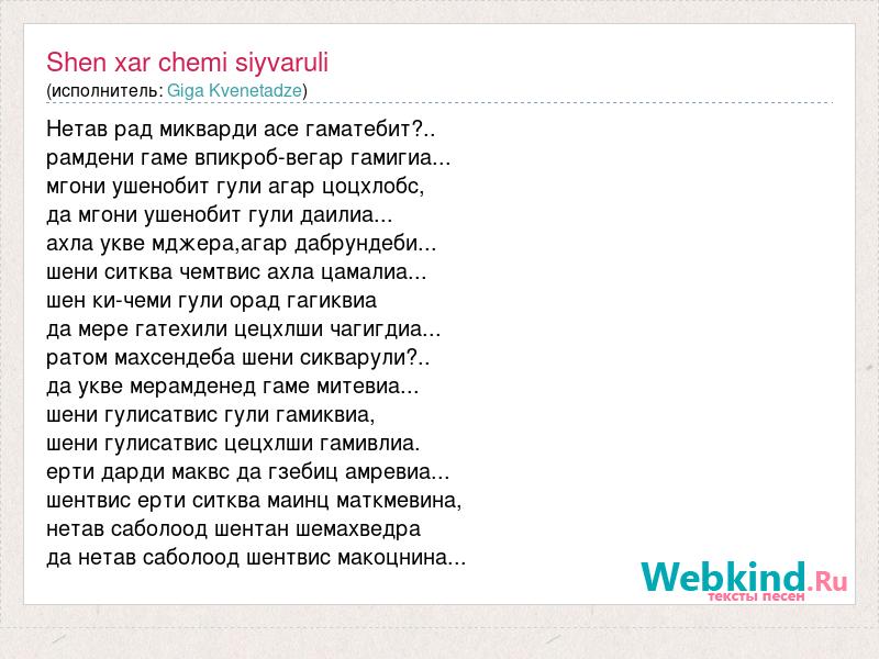 Нетав рад микварди асе гаматебит?.. рамдени гаме впикроб-вегар гамигиа... мгони ушенобит гули агар цоцхлобс, да мгони ушенобит гули даилиа... ахла укве мджера,агар дабрундеби... шени ситква чемтвис ахла цамалиа... шен ки-чеми гули орад гагиквиа да мере гатехили цецхлши чагигдиа... ратом махсендеба шени сикварули?.. да укве мерамденед гаме митевиа... шени гулисатвис гули гамиквиа, шени гулисатвис цецхлши гамивлиа. ерти дарди маквс да гзебиц амревиа... шентвис ерти ситква маинц маткмевина, нетав саболоод шентан шемахведра да нетав саболоод шентвис макоцнина...