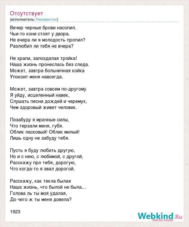Вечер черные брови насопил. Чьи-то кони стоят у двора. Не вчера ли я молодость пропил? Разлюбил ли тебя не вчера? Не храпи, запоздалая тройка! Наша жизнь пронеслась без следа. Может, завтра больничная койка Упокоит меня навсегда. Может, завтра совсем по-другому Я уйду, исцеленный навек, Слушать песни дождей и черемух, Чем здоровый живет человек. Позабуду я мрачные силы, Что терзали меня, губя. Облик ласковый! Облик милый! Лишь одну не забуду тебя. Пусть я буду любить другую, Но и с нею, с любимой, с другой, Расскажу про тебя, дорогую, Что когда-то я звал дорогой. Расскажу, как текла былая Наша жизнь, что былой не была... Голова ль ты моя удалая, До чего ж ты меня довела? 1923