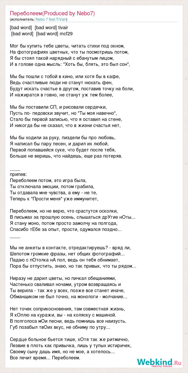 [bad word] [bad word] tivair [bad word] [bad word] mcf29 Мог бы купить тебе цветы, читать стихи под окном, На фотографиях цветных, что ты посмотришь потом, Я бы стоял такой нарядный с ебанутым лицом, И в голове одна мысль: "Хоть бы, блять, это был сон", Мы бы пошли с тобой в кино, или хотя бы в кафе, Ведь счастливые люди не станут нюхать фен, Будут искать счастье в другом, поставив точку на боли, И нажиратся в говно, не станут уж тем более, Мы бы поставили СП, и рисовали сердечки, Пусть по- педовски звучит, но "Ты моя навечно", Стало бы первой записью, что я оставил на стене, И никогда бы не сказал, что в жизни счастья нет, Мы бы ходили за руку, пиздели бы про любовь, Я написал бы пару песен, и дарил их любой, Первой попавшейся суке, что будет после тебя, Больше не веришь, что найдешь, еще раз потеряв. ____ припев: Переболеем потом, это игра была, Ты отключала эмоции, потом грабила, Ты отдавала мне чувства, а ему - не те, Теперь к "Прости меня" уже иммунитет, Переболеем, но не верю, что срастутся осколки, В письмах за прошлую осень, слышаться дрУгие нОты... Я стану моно, потом просто замолчу на полгода, Спасибо тЕбе за опыт, прости, одумался поздно... ____ Мы не анкеты в контакте, отредактируешь? - вряд ли, Шепотом громкие фразы, нет общих фотографий... Падаю с пОтолка нА пол, ведь он тебя обнимает, Пора бы отпустить, знаю, но так привык, что ты рядом... Ниразу не дарил цветы, но пичкал обещаниями, Частенько сваливал ночами, утром возвращаясь и Ты верила - так же у всех, позже все станет иначе, Обманщиком не был точно, на монологи - молчание... Нет точек соприкосновения, там совместная жизнь, Я кОплю на куражи, вы - на коляску с машиной. В полголоса мОи песни, ведь помнишь все наизусть, Губ позабыл твОих вкус, не обниму по утру... Сердце больное бьется тише, хОтя так же ритмично, Лезвие в плоть как привычка, лишь у тупых истиричек, Своему сыну дашь имя, но не мое, а хотелось... Все лечит время... Переболеем.
