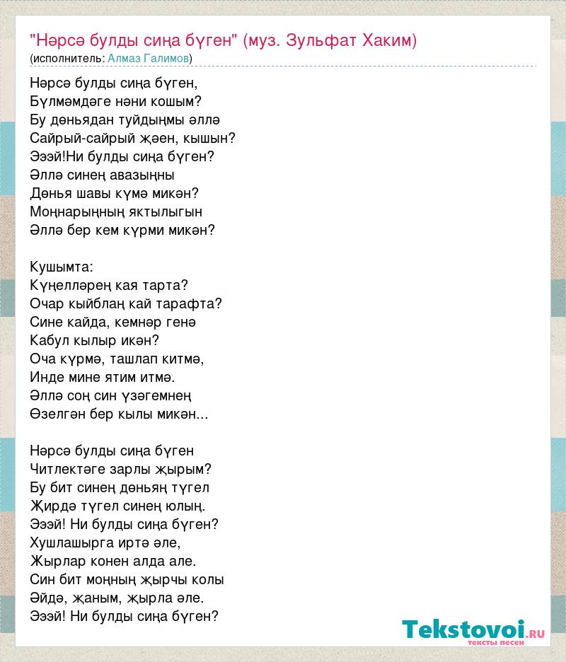 Нәрсә булды сиңа бүген, Бүлмәмдәге нәни кошым? Бу дөньядан туйдыңмы әллә Сайрый-сайрый җәен, кышын? Эээй!Ни булды сиңа бүген? Әллә синең авазыңны Дөнья шавы күмә микән? Моңнарыңның яктылыгын Әллә бер кем күрми микән? Кушымта: Күңелләрең кая тарта? Очар кыйблаң кай тарафта? Сине кайда, кемнәр генә Кабул кылыр икән? Оча күрмә, ташлап китмә, Инде мине ятим итмә. Әллә соң син үзәгемнең Өзелгән бер кылы микән... Нәрсә булды сиңа бүген Читлектәге зарлы җырым? Бу бит синең дөньяң түгел Җирдә түгел синең юлың. Эээй! Ни булды сиңа бүген? Хушлашырга иртә әле, Жырлар конен алда але. Син бит моңның җырчы колы Әйдә, җаным, җырла әле. Эээй! Ни булды сиңа бүген?