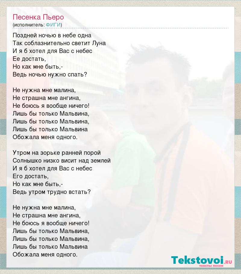 Поздней ночью в небе одна Так соблазнительно светит Луна И я б хотел для Вас с небес Ее достать, Но как мне быть,- Ведь ночью нужно спать? Не нужна мне малина, Не страшна мне ангина, Не боюсь я вообще ничего! Лишь бы только Мальвина, Лишь бы только Мальвина, Лишь бы только Мальвина Обожала меня одного. Утром на зорьке ранней порой Солнышко низко висит над землей И я б хотел для Вас с небес Его достать, Но как мне быть,- Ведь утром трудно встать? Не нужна мне малина, Не страшна мне ангина, Не боюсь я вообще ничего! Лишь бы только Мальвина, Лишь бы только Мальвина, Лишь бы только Мальвина Обожала меня одного.