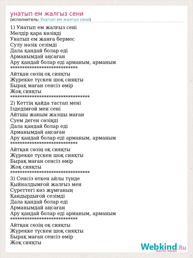 1) Унатып ем жалғыз сені Мөлдір қара көзіңді Унатып ем жанға бермес Сулу нәзік сезімді Дала қандай болар еді Арманымдай аңсаған Ару қандай болар еді арманым, арманым **************************** Айтқан сөзің оқ сияқты Жүрекке түскен шоқ сияқты Бырақ маған сенсіз өмір Жоқ сияқты ********************************* 2) Кеттің қайда тастап мені Іздедімғой мен сені Айтшы жаным жазшы маған Суем деген сөзіңді Дала қандай болар еді Арманымдай аңсаған Ару қандай болар еді арманым, арманым **************************** Айтқан сөзің оқ сияқты Жүрекке түскен шоқ сияқты Бырақ маған сенсіз өмір Жоқ сияқты ********************************* 3) Сенсіз өткен айлы түнде Қыйналдымғой жалғыз мен Сүреттегі көз жұмғаның Қандырдығой сезімді Дала қандай болар еді Арманымдай аңсаған Ару қандай болар еді арманым, арманым **************************** Айтқан сөзің оқ сияқты Жүрекке түскен шоқ сияқты Бырақ маған сенсіз өмір Жоқ сияқты