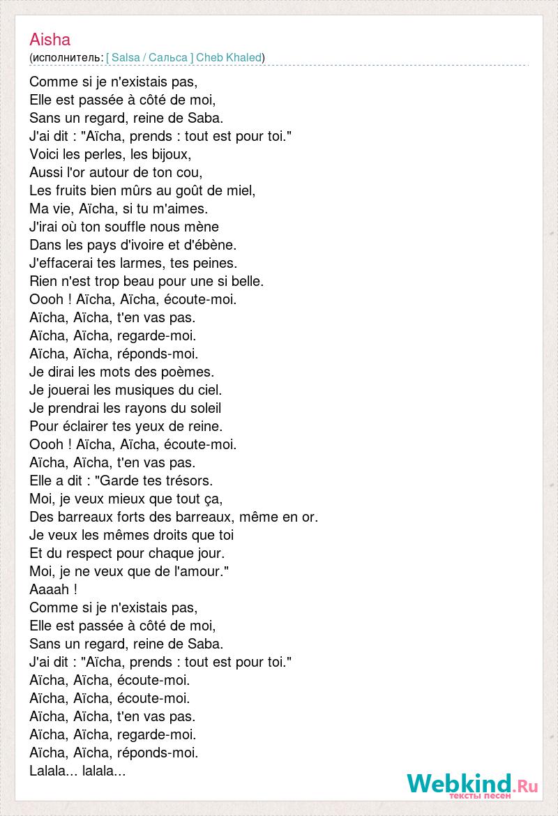 Comme si je n'existais pas, Elle est passée à côté de moi, Sans un regard, reine de Saba. J'ai dit : "Aïcha, prends : tout est pour toi." Voici les perles, les bijoux, Aussi l'or autour de ton cou, Les fruits bien mûrs au goût de miel, Ma vie, Aïcha, si tu m'aimes. J'irai où ton souffle nous mène Dans les pays d'ivoire et d'ébène. J'effacerai tes larmes, tes peines. Rien n'est trop beau pour une si belle. Oooh ! Aïcha, Aïcha, écoute-moi. Aïcha, Aïcha, t'en vas pas. Aïcha, Aïcha, regarde-moi. Aïcha, Aïcha, réponds-moi. Je dirai les mots des poèmes. Je jouerai les musiques du ciel. Je prendrai les rayons du soleil Pour éclairer tes yeux de reine. Oooh ! Aïcha, Aïcha, écoute-moi. Aïcha, Aïcha, t'en vas pas. Elle a dit : "Garde tes trésors. Moi, je veux mieux que tout ça, Des barreaux forts des barreaux, même en or. Je veux les mêmes droits que toi Et du respect pour chaque jour. Moi, je ne veux que de l'amour." Aaaah ! Comme si je n'existais pas, Elle est passée à côté de moi, Sans un regard, reine de Saba. J'ai dit : "Aïcha, prends : tout est pour toi." Aïcha, Aïcha, écoute-moi. Aïcha, Aïcha, écoute-moi. Aïcha, Aïcha, t'en vas pas. Aïcha, Aïcha, regarde-moi. Aïcha, Aïcha, réponds-moi. Lalala... lalala...