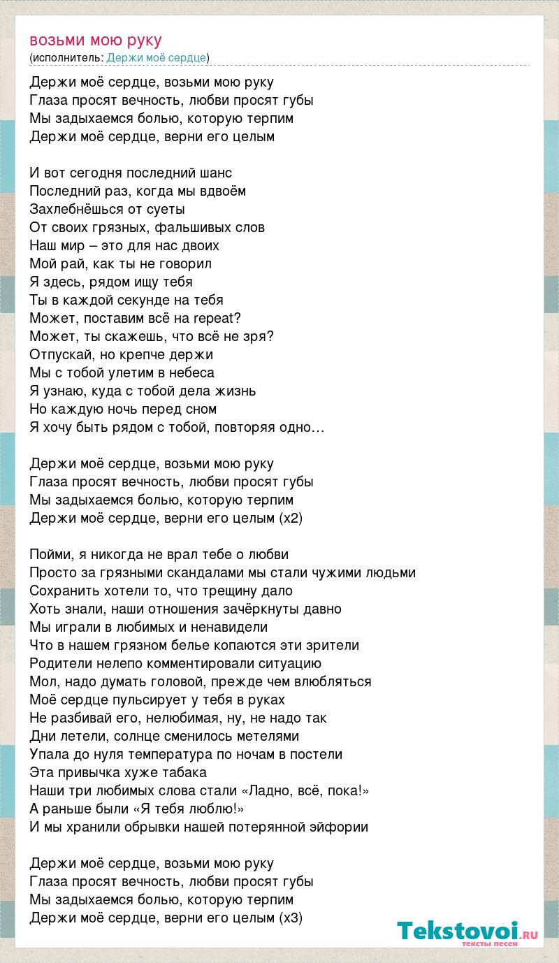 Держи моё сердце, возьми мою руку Глаза просят вечность, любви просят губы Мы задыхаемся болью, которую терпим Держи моё сердце, верни его целым И вот сегодня последний шанс Последний раз, когда мы вдвоём Захлебнёшься от суеты От своих грязных, фальшивых слов Наш мир – это для нас двоих Мой рай, как ты не говорил Я здесь, рядом ищу тебя Ты в каждой секунде на тебя Может, поставим всё на repeat? Может, ты скажешь, что всё не зря? Отпускай, но крепче держи Мы с тобой улетим в небеса Я узнаю, куда с тобой дела жизнь Но каждую ночь перед сном Я хочу быть рядом с тобой, повторяя одно… Держи моё сердце, возьми мою руку Глаза просят вечность, любви просят губы Мы задыхаемся болью, которую терпим Держи моё сердце, верни его целым (х2) Пойми, я никогда не врал тебе о любви Просто за грязными скандалами мы стали чужими людьми Сохранить хотели то, что трещину дало Хоть знали, наши отношения зачёркнуты давно Мы играли в любимых и ненавидели Что в нашем грязном белье копаются эти зрители Родители нелепо комментировали ситуацию Мол, надо думать головой, прежде чем влюбляться Моё сердце пульсирует у тебя в руках Не разбивай его, нелюбимая, ну, не надо так Дни летели, солнце сменилось метелями Упала до нуля температура по ночам в постели Эта привычка хуже табака Наши три любимых слова стали «Ладно, всё, пока!» А раньше были «Я тебя люблю!» И мы хранили обрывки нашей потерянной эйфории Держи моё сердце, возьми мою руку Глаза просят вечность, любви просят губы Мы задыхаемся болью, которую терпим Держи моё сердце, верни его целым (х3)