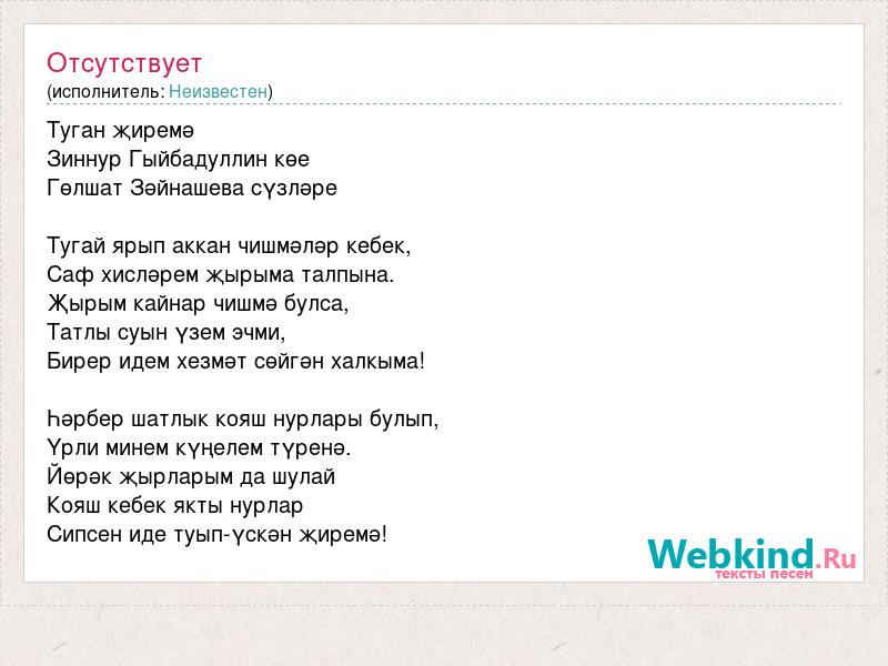 Туган җиремә Зиннур Гыйбадуллин көе Гөлшат Зәйнашева сүзләре Тугай ярып аккан чишмәләр кебек, Саф хисләрем җырыма талпына. Җырым кайнар чишмә булса, Татлы суын үзем эчми, Бирер идем хезмәт сөйгән халкыма! Һәрбер шатлык кояш нурлары булып, Үрли минем күңелем түренә. Йөрәк җырларым да шулай Кояш кебек якты нурлар Сипсен иде туып-үскән җиремә!
