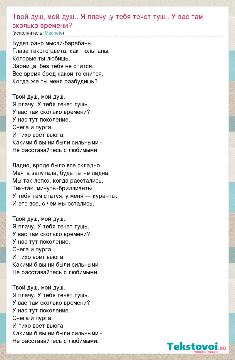 Будят рано мысли-барабаны. Глаза такого цвета, как тюльпаны, Которые ты любишь. Зарница, без тебя не спится. Все время бред какой-то снится. Когда же ты меня разбудишь? Твой душ, мой душ. Я плачу. У тебя течет тушь. У вас там сколько времени? У нас тут поколение. Снега и пурга, И тихо воет вьюга. Какими б вы ни были сильными - Не расставайтесь с любимыми Ладно, вроде было все складно. Мечта запутала, будь ты не ладна. Мы так легко, когда расстались. Тик-так, минуты-бриллианты. У тебя там статуя, у меня — куранты. И это все, с чем мы остались. Твой душ, мой душ. Я плачу. У тебя течет тушь. У вас там сколько времени? У нас тут поколение. Снега и пурга, И тихо воет вьюга Какими б вы ни были сильными - Не расставайтесь с любимыми. Твой душ, мой душ. Я плачу. У тебя течет тушь. У вас там сколько времени? У нас тут поколение. Снега и пурга, И тихо воет вьюга Какими б вы ни были сильными - Не расставайтесь с любимыми.
