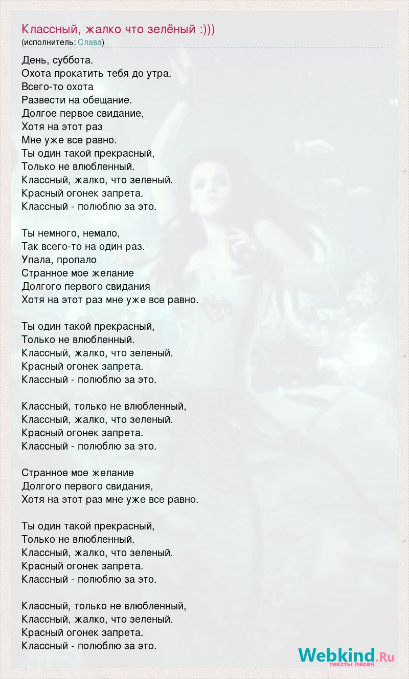 День, суббота. Охота прокатить тебя до утра. Всего-то охота Развести на обещание. Долгое первое свидание, Хотя на этот раз Мне уже все равно. Ты один такой прекрасный, Только не влюбленный. Классный, жалко, что зеленый. Красный огонек запрета. Классный - полюблю за это. Ты немного, немало, Так всего-то на один раз. Упала, пропало Странное мое желание Долгого первого свидания Хотя на этот раз мне уже все равно. Ты один такой прекрасный, Только не влюбленный. Классный, жалко, что зеленый. Красный огонек запрета. Классный - полюблю за это. Классный, только не влюбленный, Классный, жалко, что зеленый. Красный огонек запрета. Классный - полюблю за это. Странное мое желание Долгого первого свидания, Хотя на этот раз мне уже все равно. Ты один такой прекрасный, Только не влюбленный. Классный, жалко, что зеленый. Красный огонек запрета. Классный - полюблю за это. Классный, только не влюбленный, Классный, жалко, что зеленый. Красный огонек запрета. Классный - полюблю за это.