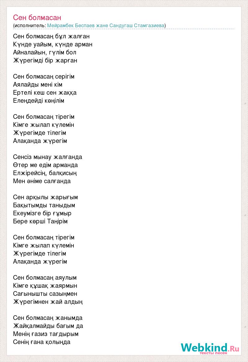Сен болмасаң бұл жалған Күнде уайым, күнде арман Айналайын, гүлім бол Жүрегімді бір жарған Сен болмасаң серігім Аялайды мені кім Ертелі кеш сен жаққа Елеңдейді көңілім Сен болмасаң тірегім Кімге жылап күлемін Жүрегімде тілегім Алақанда жүрегім Сенсіз мынау жалғанда Өтер ме едім арманда Елжірейсің, балқисың Мен әніме салғанда Сен арқылы жарығым Бақытымды таныдым Екеумізге бір ғұмыр Бере көрші Таңірім Сен болмасаң тірегім Кімге жылап күлемін Жүрегімде тілегім Алақанда жүрегім Сен болмасаң аяулым Кімге құшақ жаярмын Сағынышты сазыңмен Жүрегімнен жай алдың Сен болмасаң жанымда Жайқалмайды бағым да Менің ғазиз тағдырым Сенің ғана қолыңда