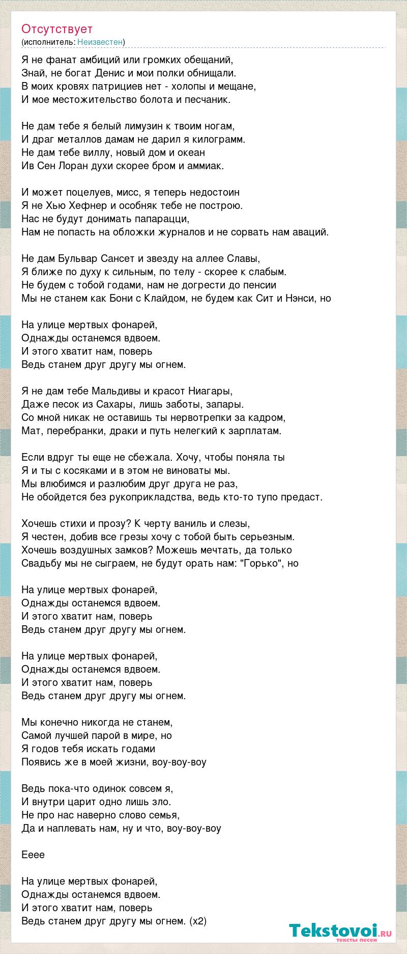 Я не фанат амбиций или громких обещаний, Знай, не богат Денис и мои полки обнищали. В моих кровях патрициев нет - холопы и мещане, И мое местожительство болота и песчаник. Не дам тебе я белый лимузин к твоим ногам, И драг металлов дамам не дарил я килограмм. Не дам тебе виллу, новый дом и океан Ив Сен Лоран духи скорее бром и аммиак. И может поцелуев, мисс, я теперь недостоин Я не Хью Хефнер и особняк тебе не построю. Нас не будут донимать папарацци, Нам не попасть на обложки журналов и не сорвать нам аваций. Не дам Бульвар Сансет и звезду на аллее Славы, Я ближе по духу к сильным, по телу - скорее к слабым. Не будем с тобой годами, нам не догрести до пенсии Мы не станем как Бони с Клайдом, не будем как Сит и Нэнси, но На улице мертвых фонарей, Однажды останемся вдвоем. И этого хватит нам, поверь Ведь станем друг другу мы огнем. Я не дам тебе Мальдивы и красот Ниагары, Даже песок из Сахары, лишь заботы, запары. Со мной никак не оставишь ты нервотрепки за кадром, Мат, перебранки, драки и путь нелегкий к зарплатам. Если вдруг ты еще не сбежала. Хочу, чтобы поняла ты Я и ты с косяками и в этом не виноваты мы. Мы влюбимся и разлюбим друг друга не раз, Не обойдется без рукоприкладства, ведь кто-то тупо предаст. Хочешь стихи и прозу? К черту ваниль и слезы, Я честен, добив все грезы хочу с тобой быть серьезным. Хочешь воздушных замков? Можешь мечтать, да только Свадьбу мы не сыграем, не будут орать нам: "Горько", но На улице мертвых фонарей, Однажды останемся вдвоем. И этого хватит нам, поверь Ведь станем друг другу мы огнем. На улице мертвых фонарей, Однажды останемся вдвоем. И этого хватит нам, поверь Ведь станем друг другу мы огнем. Мы конечно никогда не станем, Самой лучшей парой в мире, но Я годов тебя искать годами Появись же в моей жизни, воу-воу-воу Ведь пока-что одинок совсем я, И внутри царит одно лишь зло. Не про нас наверно слово семья, Да и наплевать нам, ну и что, воу-воу-воу Ееее На улице мертвых фонарей, Однажды останемся вдвоем. И этого хватит нам, поверь Ведь станем друг другу мы огнем. (x2)