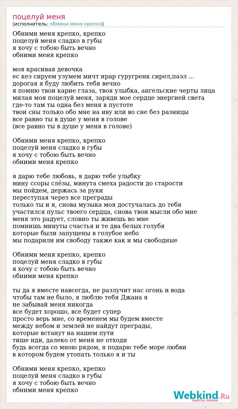 Обними меня крепко, крепко поцелуй меня сладко в губы я хочу с тобою быть вечно обними меня крепко моя красивая девочка ес кез сируем узумем мичт ирар гуругренк сирел,паэл ... дорогая я буду любить тебя вечно я помню твои карие глаза, твоя улыбка, ангельские черты лица милая моя поцелуй меня, заряди мое сердце энергией света где-то там ты одна без меня в пустоте твои сны только обо мне на иву или во сне без разницы все равно ты в душе у меня в голове (все равно ты в душе у меня в голове) Обними меня крепко, крепко поцелуй меня сладко в губы я хочу с тобою быть вечно обними меня крепко я дарю тебе любовь, я дарю тебе улыбку мину ссоры слёзы, минута смеха радости до старости мы пойдем, держась за руки переступая через все преграды только ты и я, снова музыка моя достучалась до тебя участился пульс твоего сердца, снова твои мысли обо мне меня это радует, словно ты живешь во мне помнишь минуты счастья и те два белых голубя которые были запущены в голубое небо мы подарили им свободу также как и мы свободные Обними меня крепко, крепко поцелуй меня сладко в губы я хочу с тобою быть вечно обними меня крепко ты да я вместе навсегда, не разлучит нас огонь и вода чтобы там не было, я люблю тебя Джана я не забывай меня никогда все будет хорошо, все будет супер просто верь мне, со временем мы будем вместе между небом и землей не найдут преграды, которые встанут на нашем пути тише иди, далеко от меня не отходи будь всегда со мною рядом, я подарю тебе море любви в котором будем утопать только я и ты Обними меня крепко, крепко поцелуй меня сладко в губы я хочу с тобою быть вечно обними меня крепко
