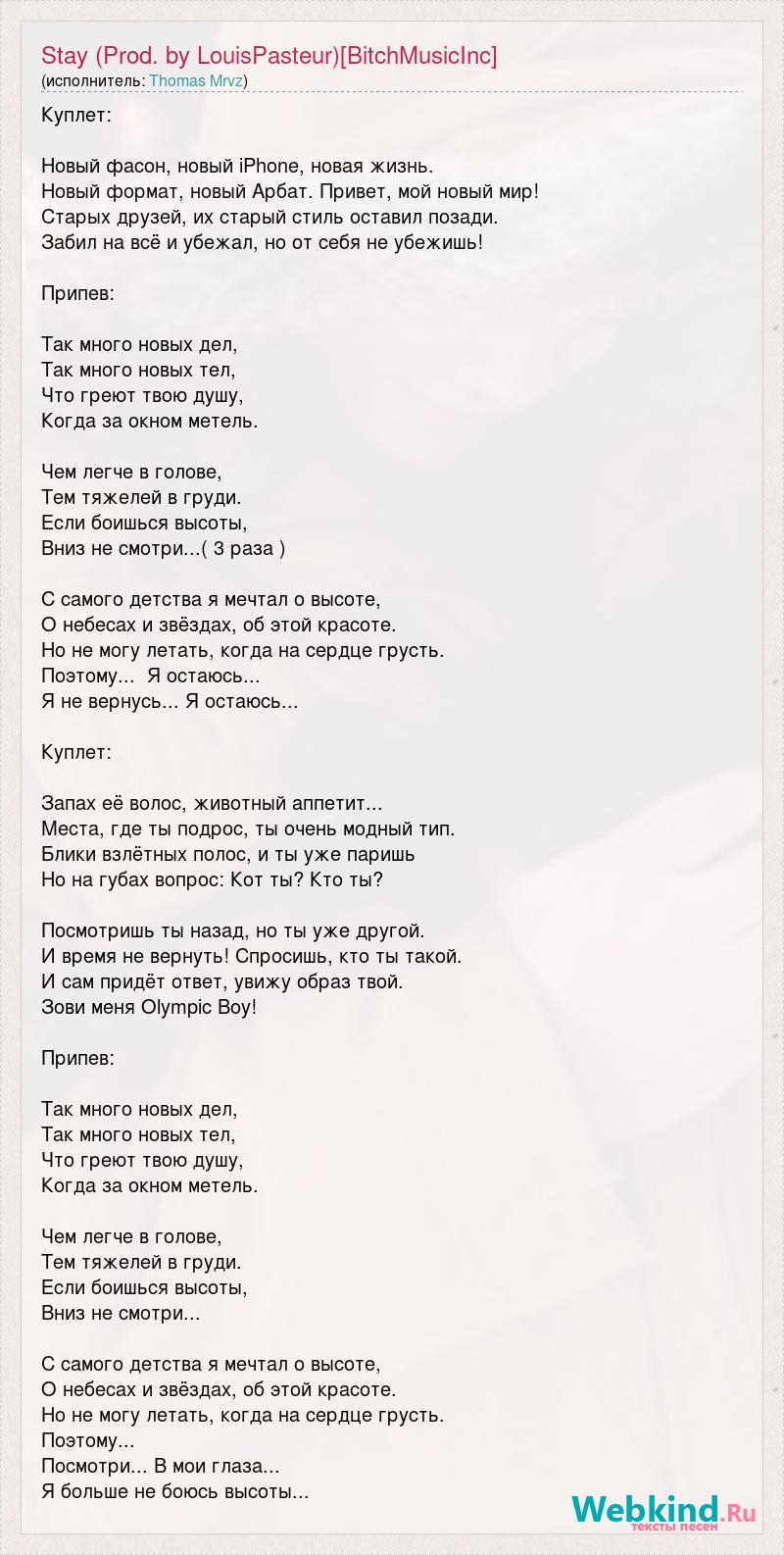 Куплет: Новый фасон, новый iPhone, новая жизнь. Новый формат, новый Арбат. Привет, мой новый мир! Старых друзей, их старый стиль оставил позади. Забил на всё и убежал, но от себя не убежишь! Припев: Так много новых дел, Так много новых тел, Что греют твою душу, Когда за окном метель. Чем легче в голове, Тем тяжелей в груди. Если боишься высоты, Вниз не смотри...( 3 раза ) С самого детства я мечтал о высоте, О небесах и звёздах, об этой красоте. Но не могу летать, когда на сердце грусть. Поэтому... Я остаюсь... Я не вернусь... Я остаюсь... Куплет: Запах её волос, животный аппетит... Места, где ты подрос, ты очень модный тип. Блики взлётных полос, и ты уже паришь Но на губах вопрос: Кот ты? Кто ты? Посмотришь ты назад, но ты уже другой. И время не вернуть! Спросишь, кто ты такой. И сам придёт ответ, увижу образ твой. Зови меня Olympic Boy! Припев: Так много новых дел, Так много новых тел, Что греют твою душу, Когда за окном метель. Чем легче в голове, Тем тяжелей в груди. Если боишься высоты, Вниз не смотри... С самого детства я мечтал о высоте, О небесах и звёздах, об этой красоте. Но не могу летать, когда на сердце грусть. Поэтому... Посмотри... В мои глаза... Я больше не боюсь высоты...