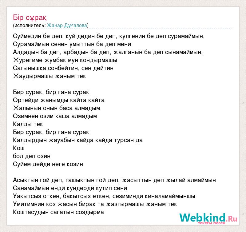 Суймедин бе деп, куй дедин бе деп, кулгенин бе деп сурамаймын, Сурамаймын сенен умыттын ба деп мени Алдадын ба деп, арбадын ба деп, жалганын ба деп сынамаймын, Журегиме жумбак мун кондырмашы Сагынышка сонбейтин, сен дейтин Жаудырмашы жаным тек Бир сурак, бир гана сурак Ортейди жанымды кайта кайта Жалынын онын баса алмадым Озимнен озим каша алмадым Калды тек Бир сурак, бир гана сурак Калдырдын жауабын кайда кайда турсан да Кош бол деп озин Суйем дейди неге козин Асыктын гой деп, гашыкпын гой деп, жасыттын деп жылай алмаймын Санамаймын енди кундерди кутип сени Уакытсыз откен, бакытсыз еткен, сезиминди киналамаймыншы Умитимнин коз жасын бирак та жазгырмашы жаным тек Коштасудын сагатын создырма