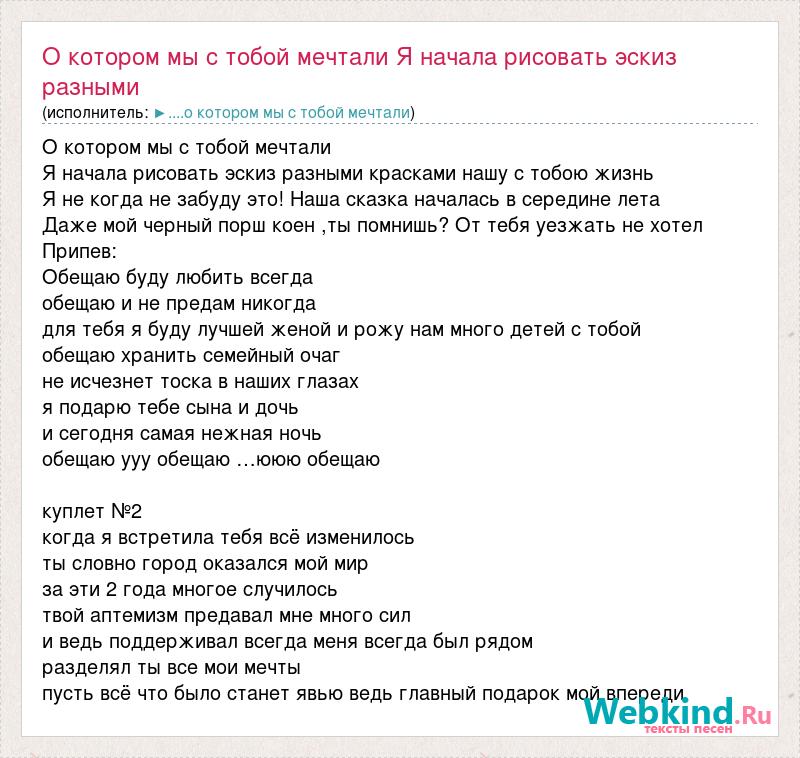 О котором мы с тобой мечтали Я начала рисовать эскиз разными красками нашу с тобою жизнь Я не когда не забуду это! Наша сказка началась в середине лета Даже мой черный порш коен ,ты помнишь? От тебя уезжать не хотел Припев: Обещаю буду любить всегда обещаю и не предам никогда для тебя я буду лучшей женой и рожу нам много детей с тобой обещаю хранить семейный очаг не исчезнет тоска в наших глазах я подарю тебе сына и дочь и сегодня самая нежная ночь обещаю ууу обещаю …ююю обещаю куплет №2 когда я встретила тебя всё изменилось ты словно город оказался мой мир за эти 2 года многое случилось твой аптемизм предавал мне много сил и ведь поддерживал всегда меня всегда был рядом разделял ты все мои мечты пусть всё что было станет явью ведь главный подарок мой впереди
