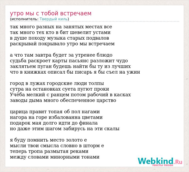 так много разных на занятых местах все так много тех кто в бит шевелит устами в душе походу музыка старых подвалов раскрывай покрывало утро мы встречаем а что там завтра будет за утренее блюдо судьба раскроет карты пасьянс разложит чудо заклятьем пуган будешь найти бы ту из лучших что в книжках описал бы писарь я бы съел на ужин город в лужах городские люди толпы сутра на остановках суета пугют проки Учёба мелкий с ранцем потом рабочий в касках заводы дыма много обеспеченное царство царица правит топая об пол нагами нагора на горе избалованна цветами подарок мая долго идти до финала но даже этим шагом забирусь на эти скалы я буду помнить место золото е мысли твои смысла словно в шторм е теперь тропа размытая реками между словами минорными тонами