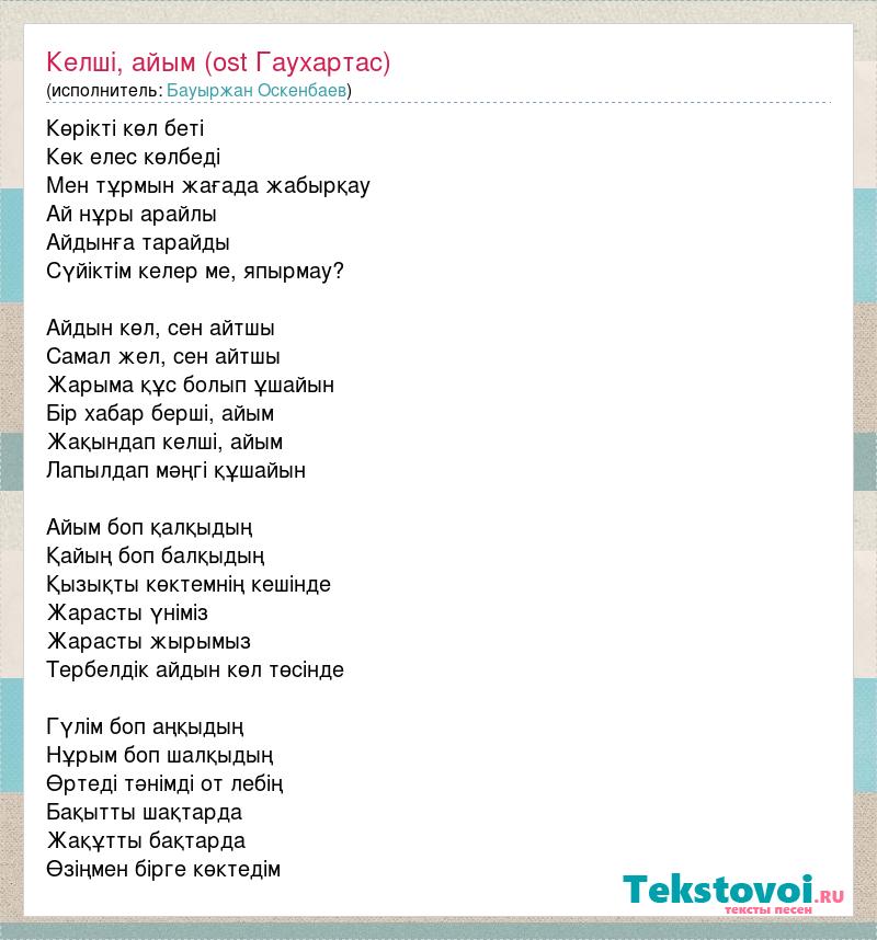 Көрікті көл беті Көк елес көлбеді Мен тұрмын жағада жабырқау Ай нұры арайлы Айдынға тарайды Сүйіктім келер ме, япырмау? Айдын көл, сен айтшы Самал жел, сен айтшы Жарыма құс болып ұшайын Бір хабар берші, айым Жақындап келші, айым Лапылдап мәңгі құшайын Айым боп қалқыдың Қайың боп балқыдың Қызықты көктемнің кешінде Жарасты үніміз Жарасты жырымыз Тербелдік айдын көл төсінде Гүлім боп аңқыдың Нұрым боп шалқыдың Өртеді тәнімді от лебің Бақытты шақтарда Жақұтты бақтарда Өзіңмен бірге көктедім
