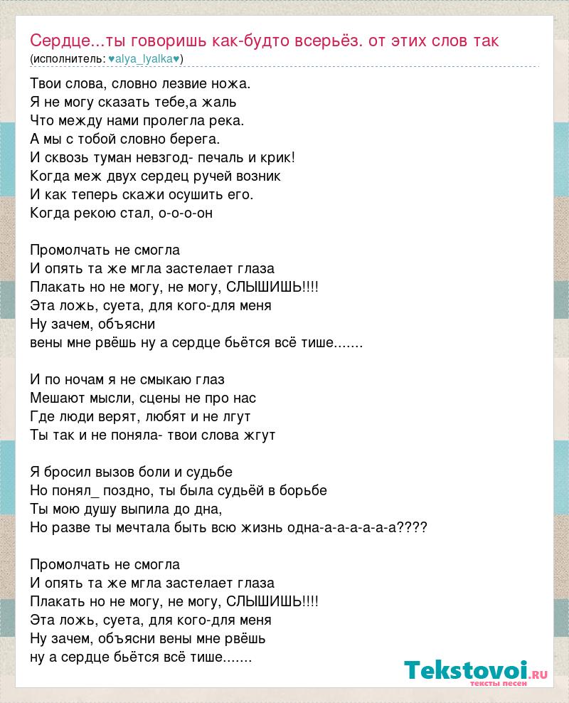 Твои слова, словно лезвие ножа. Я не могу сказать тебе,а жаль Что между нами пролегла река. А мы с тобой словно берега. И сквозь туман невзгод- печаль и крик! Когда меж двух сердец ручей возник И как теперь скажи осушить его. Когда рекою стал, о-о-о-он Промолчать не смогла И опять та же мгла застелает глаза Плакать но не могу, не могу, СЛЫШИШЬ!!!! Эта ложь, суета, для кого-для меня Ну зачем, объясни вены мне рвёшь ну а сердце бьётся всё тише....... И по ночам я не смыкаю глаз Мешают мысли, сцены не про нас Где люди верят, любят и не лгут Ты так и не поняла- твои слова жгут Я бросил вызов боли и судьбе Но понял_ поздно, ты была судьёй в борьбе Ты мою душу выпила до дна, Но разве ты мечтала быть всю жизнь одна-а-а-а-а-а-а???? Промолчать не смогла И опять та же мгла застелает глаза Плакать но не могу, не могу, СЛЫШИШЬ!!!! Эта ложь, суета, для кого-для меня Ну зачем, объясни вены мне рвёшь ну а сердце бьётся всё тише.......