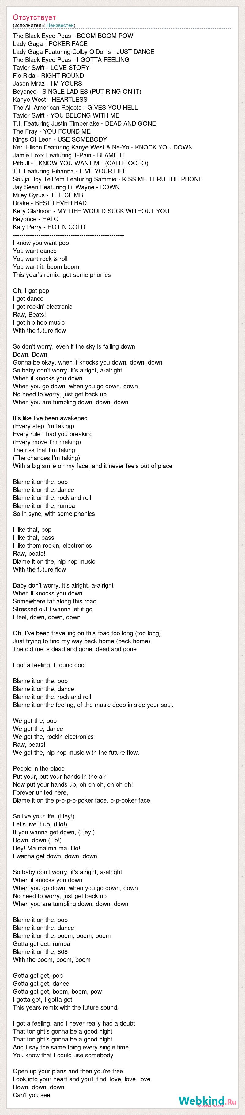 The Black Eyed Peas - BOOM BOOM POW Lady Gaga - POKER FACE Lady Gaga Featuring Colby O'Donis - JUST DANCE The Black Eyed Peas - I GOTTA FEELING Taylor Swift - LOVE STORY Flo Rida - RIGHT ROUND Jason Mraz - I'M YOURS Beyonce - SINGLE LADIES (PUT RING ON IT) Kanye West - HEARTLESS The All-American Rejects - GIVES YOU HELL Taylor Swift - YOU BELONG WITH ME T.I. Featuring Justin Timberlake - DEAD AND GONE The Fray - YOU FOUND ME Kings Of Leon - USE SOMEBODY Keri Hilson Featuring Kanye West & Ne-Yo - KNOCK YOU DOWN Jamie Foxx Featuring T-Pain - BLAME IT Pitbull - I KNOW YOU WANT ME (CALLE OCHO) T.I. Featuring Rihanna - LIVE YOUR LIFE Soulja Boy Tell 'em Featuring Sammie - KISS ME THRU THE PHONE Jay Sean Featuring Lil Wayne - DOWN Miley Cyrus - THE CLIMB Drake - BEST I EVER HAD Kelly Clarkson - MY LIFE WOULD SUCK WITHOUT YOU Beyonce - HALO Katy Perry - HOT N COLD ---------------------------------------------------- I know you want pop You want dance You want rock & roll You want it, boom boom This year’s remix, got some phonics Oh, I got pop I got dance I got rockin’ electronic Raw, Beats! I got hip hop music With the future flow So don’t worry, even if the sky is falling down Down, Down Gonna be okay, when it knocks you down, down, down So baby don’t worry, it’s alright, a-alright When it knocks you down When you go down, when you go down, down No need to worry, just get back up When you are tumbling down, down, down It’s like I’ve been awakened (Every step I’m taking) Every rule I had you breaking (Every move I’m making) The risk that I’m taking (The chances I’m taking) With a big smile on my face, and it never feels out of place Blame it on the, pop Blame it on the, dance Blame it on the, rock and roll Blame it on the, rumba So in sync, with some phonics I like that, pop I like that, bass I like them rockin, electronics Raw, beats! Blame it on the, hip hop music With the future flow Baby don’t worry, it’s alright, a-alright When it knocks you down Somewhere far along this road Stressed out I wanna let it go I feel, down, down, down Oh, I’ve been travelling on this road too long (too long) Just trying to find my way back home (back home) The old me is dead and gone, dead and gone I got a feeling, I found god. Blame it on the, pop Blame it on the, dance Blame it on the, rock and roll Blame it on the feeling, of the music deep in side your soul. We got the, pop We got the, dance We got the, rockin electronics Raw, beats! We got the, hip hop music with the future flow. People in the place Put your, put your hands in the air Now put your hands up, oh oh oh, oh oh oh! Forever united here, Blame it on the p-p-p-p-poker face, p-p-poker face So live your life, (Hey!) Let’s live it up, (Ho!) If you wanna get down, (Hey!) Down, down (Ho!) Hey! Ma ma ma ma, Ho! I wanna get down, down, down. So baby don’t worry, it’s alright, a-alright When it knocks you down When you go down, when you go down, down No need to worry, just get back up When you are tumbling down, down, down Blame it on the, pop Blame it on the, dance Blame it on the, boom, boom, boom Gotta get get, rumba Blame it on the, 808 With the boom, boom, boom Gotta get get, pop Gotta get get, dance Gotta get get, boom, boom, pow I gotta get, I gotta get This years remix with the future sound. I got a feeling, and I never really had a doubt That tonight’s gonna be a good night That tonight’s gonna be a good night And I say the same thing every single time You know that I could use somebody Open up your plans and then you’re free Look into your heart and you’ll find, love, love, love Down, down, down Can’t you see