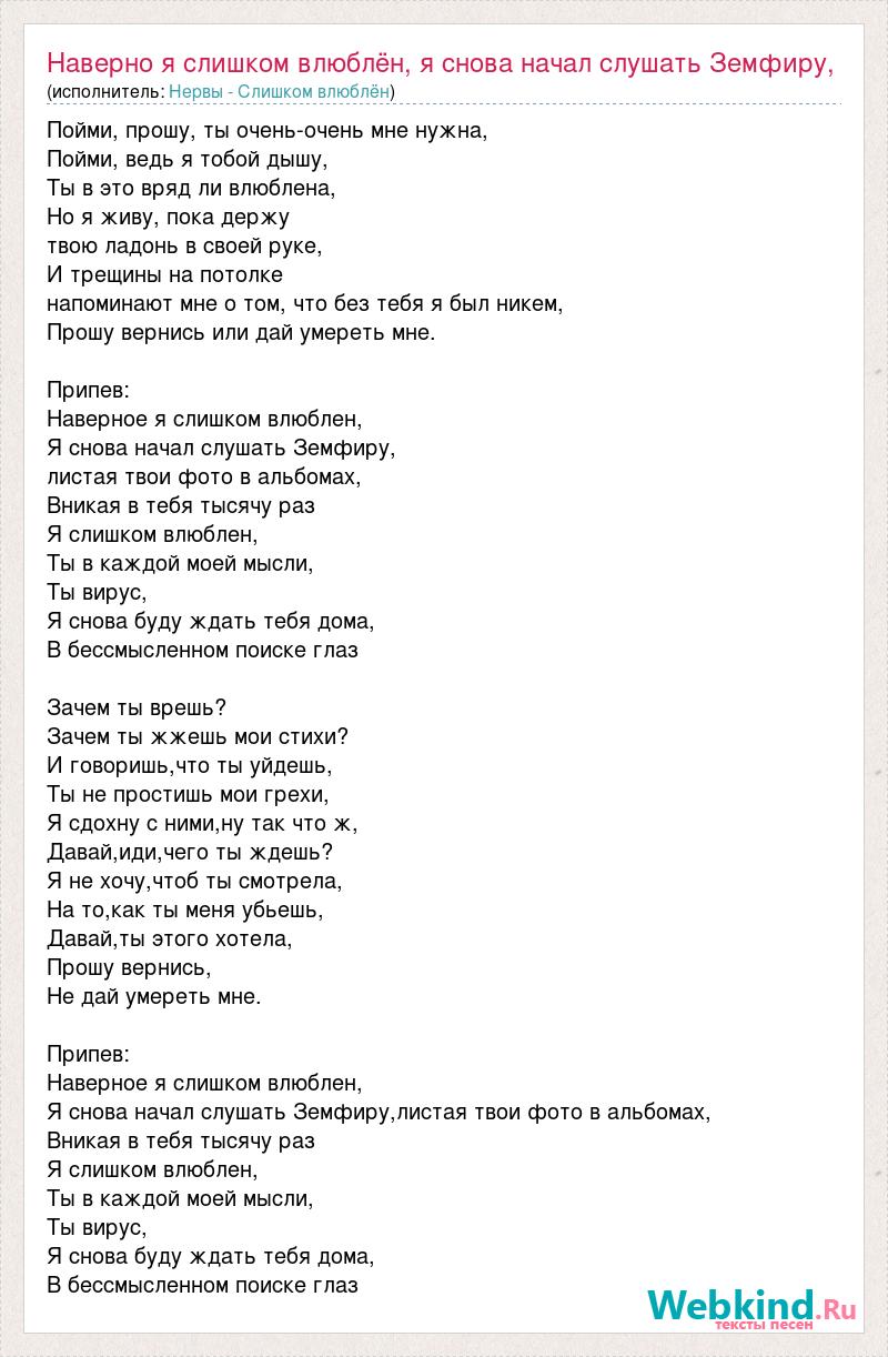 Пойми, прошу, ты очень-очень мне нужна, Пойми, ведь я тобой дышу, Ты в это вряд ли влюблена, Но я живу, пока держу твою ладонь в своей руке, И трещины на потолке напоминают мне о том, что без тебя я был никем, Прошу вернись или дай умереть мне. Припев: Наверное я слишком влюблен, Я снова начал слушать Земфиру, листая твои фото в альбомах, Вникая в тебя тысячу раз Я слишком влюблен, Ты в каждой моей мысли, Ты вирус, Я снова буду ждать тебя дома, В бессмысленном поиске глаз Зачем ты врешь? Зачем ты жжешь мои стихи? И говоришь,что ты уйдешь, Ты не простишь мои грехи, Я сдохну с ними,ну так что ж, Давай,иди,чего ты ждешь? Я не хочу,чтоб ты смотрела, На то,как ты меня убьешь, Давай,ты этого хотела, Прошу вернись, Не дай умереть мне. Припев: Наверное я слишком влюблен, Я снова начал слушать Земфиру,листая твои фото в альбомах, Вникая в тебя тысячу раз Я слишком влюблен, Ты в каждой моей мысли, Ты вирус, Я снова буду ждать тебя дома, В бессмысленном поиске глаз