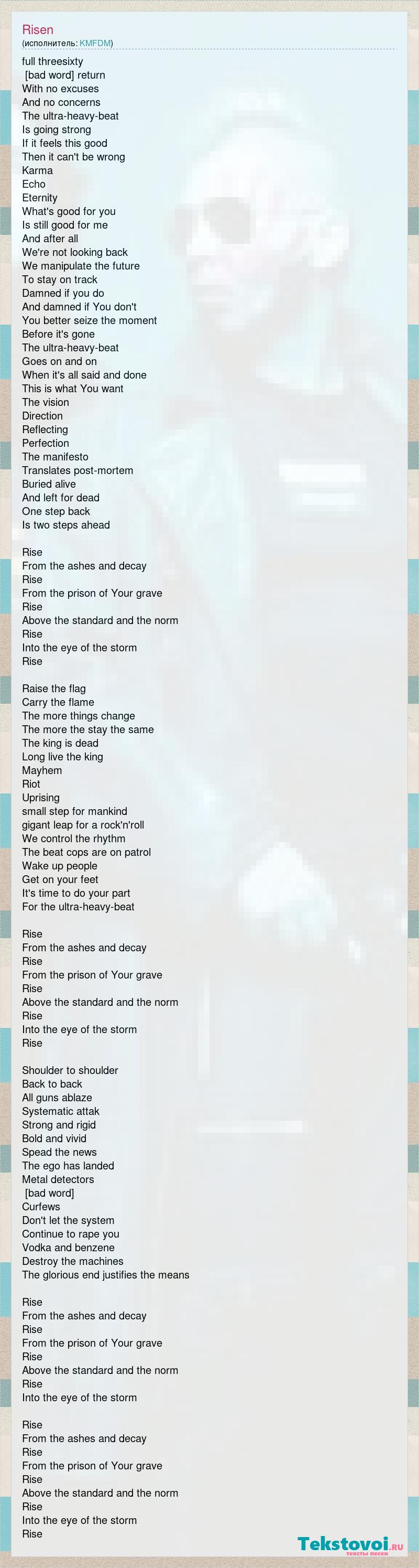 full threesixty [bad word] return With no excuses And no concerns The ultra-heavy-beat Is going strong If it feels this good Then it can't be wrong Karma Echo Eternity What's good for you Is still good for me And after all We're not looking back We manipulate the future To stay on track Damned if you do And damned if You don't You better seize the moment Before it's gone The ultra-heavy-beat Goes on and on When it's all said and done This is what You want The vision Direction Reflecting Perfection The manifesto Translates post-mortem Buried alive And left for dead One step back Is two steps ahead Rise From the ashes and decay Rise From the prison of Your grave Rise Above the standard and the norm Rise Into the eye of the storm Rise Raise the flag Carry the flame The more things change The more the stay the same The king is dead Long live the king Mayhem Riot Uprising small step for mankind gigant leap for a rock'n'roll We control the rhythm The beat cops are on patrol Wake up people Get on your feet It's time to do your part For the ultra-heavy-beat Rise From the ashes and decay Rise From the prison of Your grave Rise Above the standard and the norm Rise Into the eye of the storm Rise Shoulder to shoulder Back to back All guns ablaze Systematic attak Strong and rigid Bold and vivid Spead the news The ego has landed Metal detectors [bad word] Curfews Don't let the system Continue to rape you Vodka and benzene Destroy the machines The glorious end justifies the means Rise From the ashes and decay Rise From the prison of Your grave Rise Above the standard and the norm Rise Into the eye of the storm Rise From the ashes and decay Rise From the prison of Your grave Rise Above the standard and the norm Rise Into the eye of the storm Rise