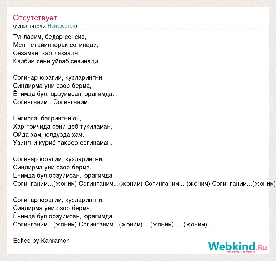 Тунларим, бедор сенсиз, Мен нетайин юрак согинади, Сезаман, хар лахзада Калбим сени уйлаб севинади. Согинар юрагим, кузларингни Синдирма уни озор берма, Ёнимда бул, орзуимсан юрагимда... Согинганим.. Согинганим.. Ёмгирга, багрингни оч, Хар томчида сени деб тукиламан, Ойда хам, юлдузда хам, Узингни куриб такрор согинаман. Согинар юрагим, кузларингни, Синдирма уни озор берма, Ёнимда бул орзуимсан, юрагимда Согинганим...(жоним) Согинганим...(жоним) Согинганим... (жоним) Согинганим...(жоним) Согинар юрагим, кузларингни, Синдирма уни озор берма, Ёнимда бул орзуимсан, юрагимда Согинганим...(жоним) Согинганим...(жоним)... (жоним).... (жоним).... Edited by Kahramon