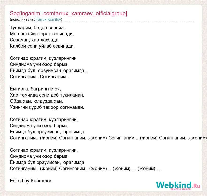 Тунларим, бедор сенсиз, Мен нетайин юрак согинади, Сезаман, хар лахзада Калбим сени уйлаб севинади. Согинар юрагим, кузларингни Синдирма уни озор берма, Ёнимда бул, орзуимсан юрагимда... Согинганим.. Согинганим.. Ёмгирга, багрингни оч, Хар томчида сени деб тукиламан, Ойда хам, юлдузда хам, Узингни куриб такрор согинаман. Согинар юрагим, кузларингни, Синдирма уни озор берма, Ёнимда бул орзуимсан, юрагимда Согинганим...(жоним) Согинганим...(жоним) Согинганим... (жоним) Согинганим...(жоним) Согинар юрагим, кузларингни, Синдирма уни озор берма, Ёнимда бул орзуимсан, юрагимда Согинганим...(жоним) Согинганим...(жоним)... (жоним).... (жоним).... Edited by Kahramon