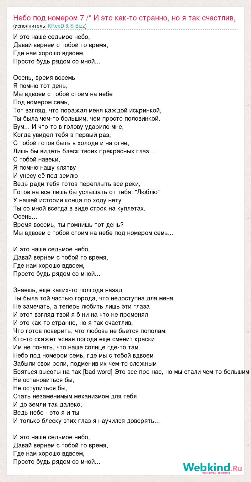 И это наше седьмое небо, Давай вернем с тобой то время, Где нам хорошо вдвоем, Просто будь рядом со мной... Осень, время восемь Я помню тот день, Мы вдвоем с тобой стоим на небе Под номером семь, Тот взгляд, что поражал меня каждой искринкой, Ты была чем-то большим, чем просто половинкой. Бум... И что-то в голову ударило мне, Когда увидел тебя в первый раз, С тобой готов быть в холоде и на огне, Лишь бы видеть блеск твоих прекрасных глаз... С тобой навеки, Я помню нашу клятву И унесу её под землю Ведь ради тебя готов переплыть все реки, Готов на все лишь бы услышать от тебя: "Люблю" У нашей истории конца по ходу нету Ты со мной всегда в виде строк на куплетах. Осень... Время восемь, ты помнишь тот день? Мы вдвоем с тобой стоим на небе под номером семь... И это наше седьмое небо, Давай вернем с тобой то время, Где нам хорошо вдвоем, Просто будь рядом со мной... Знаешь, еще каких-то полгода назад Ты была той частью города, что недоступна для меня Не замечать, а теперь любить лишь эти глаза И этот взгляд твой я б ни на что не променял И это как-то странно, но я так счастлив, Что готов поверить, что любовь не бьется пополам. Кто-то скажет ясная погода еще сменит краски Им не понять, что наше солнце где-то там. Небо под номером семь, где мы с тобой вдвоем Забыли свои роли, подменив их чем-то сложным Бояться высоты на так [bad word] Это все про нас, но мы стали чем-то большим Не остановиться бы, Не оступиться бы, Стать незаменимым механизмом для тебя И до земли так далеко, Ведь небо - это я и ты И только блеску этих глаз я научился доверять... И это наше седьмое небо, Давай вернем с тобой то время, Где нам хорошо вдвоем, Просто будь рядом со мной...