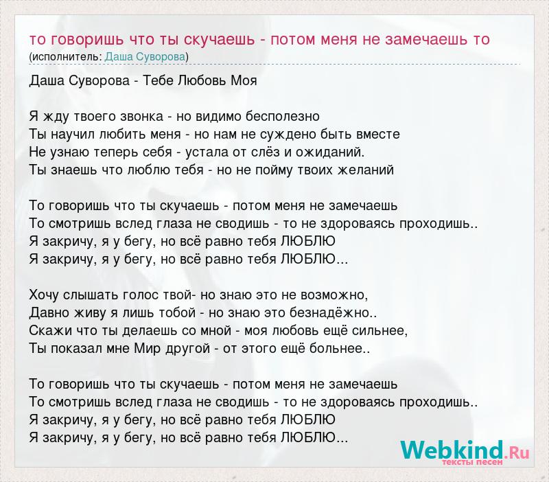 Главная→Исполнители→Даша Суворова→То говоришь что ты скучаешь - потом меня не замечаешь то смотришь вслед
