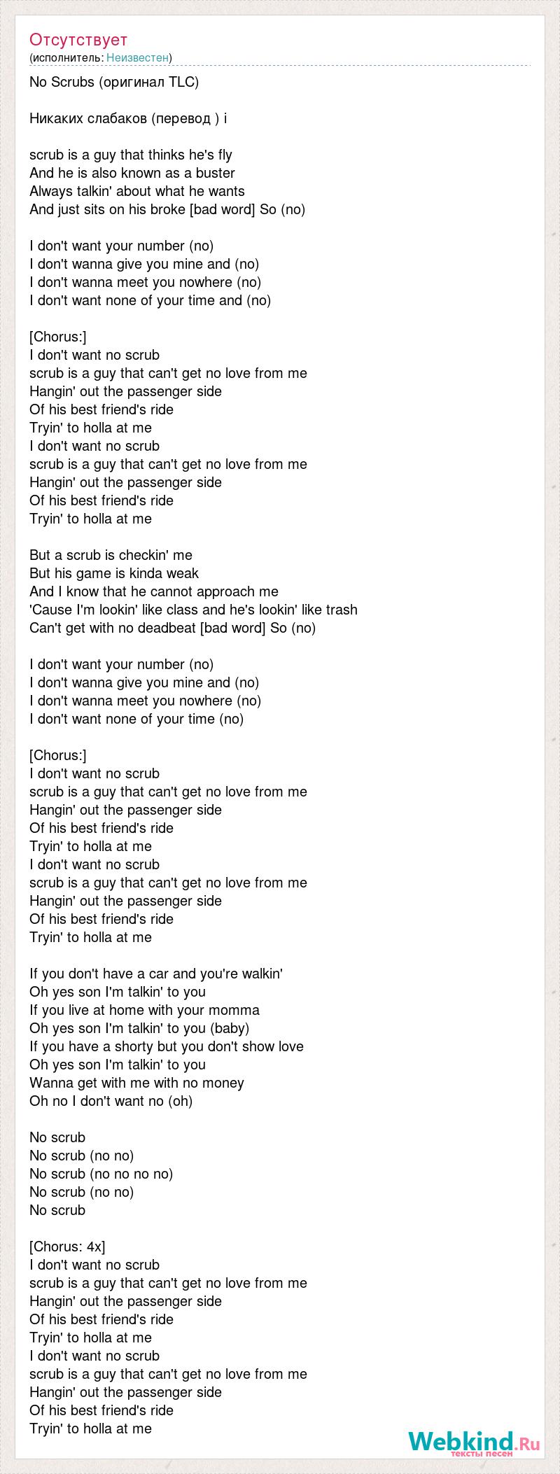 No Scrubs (оригинал TLC) Никаких слабаков (перевод ) i scrub is a guy that thinks he's fly And he is also known as a buster Always talkin' about what he wants And just sits on his broke [bad word] So (no) I don't want your number (no) I don't wanna give you mine and (no) I don't wanna meet you nowhere (no) I don't want none of your time and (no) [Chorus:] I don't want no scrub scrub is a guy that can't get no love from me Hangin' out the passenger side Of his best friend's ride Tryin' to holla at me I don't want no scrub scrub is a guy that can't get no love from me Hangin' out the passenger side Of his best friend's ride Tryin' to holla at me But a scrub is checkin' me But his game is kinda weak And I know that he cannot approach me 'Cause I'm lookin' like class and he's lookin' like trash Can't get with no deadbeat [bad word] So (no) I don't want your number (no) I don't wanna give you mine and (no) I don't wanna meet you nowhere (no) I don't want none of your time (no) [Chorus:] I don't want no scrub scrub is a guy that can't get no love from me Hangin' out the passenger side Of his best friend's ride Tryin' to holla at me I don't want no scrub scrub is a guy that can't get no love from me Hangin' out the passenger side Of his best friend's ride Tryin' to holla at me If you don't have a car and you're walkin' Oh yes son I'm talkin' to you If you live at home with your momma Oh yes son I'm talkin' to you (baby) If you have a shorty but you don't show love Oh yes son I'm talkin' to you Wanna get with me with no money Oh no I don't want no (oh) No scrub No scrub (no no) No scrub (no no no no) No scrub (no no) No scrub [Chorus: 4х] I don't want no scrub scrub is a guy that can't get no love from me Hangin' out the passenger side Of his best friend's ride Tryin' to holla at me I don't want no scrub scrub is a guy that can't get no love from me Hangin' out the passenger side Of his best friend's ride Tryin' to holla at me