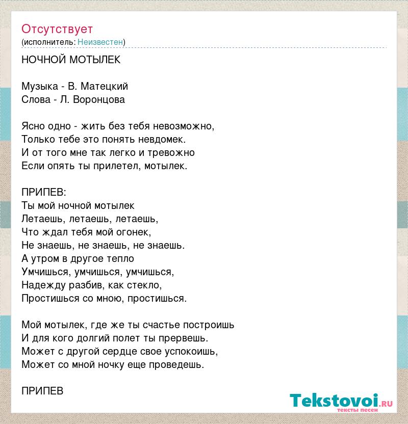 НОЧНОЙ МОТЫЛЕК Музыка - В. Матецкий Слова - Л. Воронцова Ясно одно - жить без тебя невозможно, Только тебе это понять невдомек. И от того мне так легко и тревожно Если опять ты прилетел, мотылек. ПРИПЕВ: Ты мой ночной мотылек Летаешь, летаешь, летаешь, Что ждал тебя мой огонек, Не знаешь, не знаешь, не знаешь. А утром в другое тепло Умчишься, умчишься, умчишься, Надежду разбив, как стекло, Простишься со мною, простишься. Мой мотылек, где же ты счастье построишь И для кого долгий полет ты прервешь. Может с другой сердце свое успокоишь, Может со мной ночку еще проведешь. ПРИПЕВ