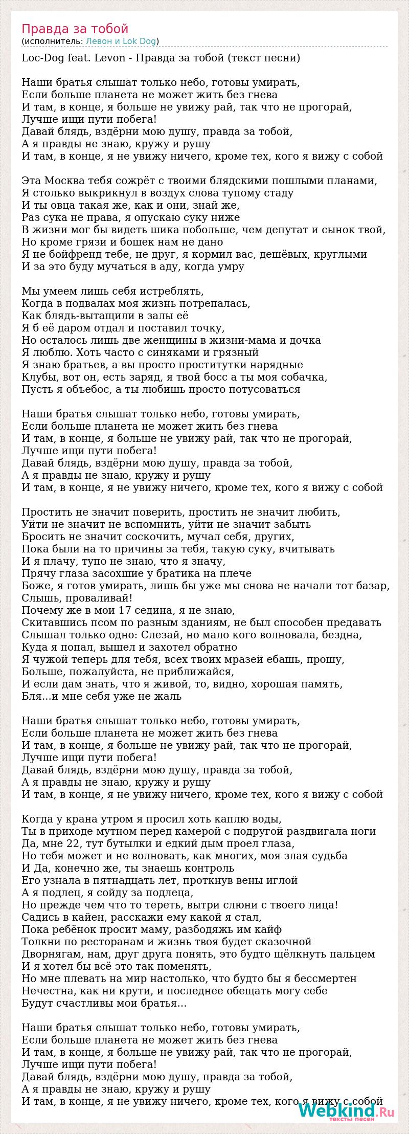 Loc-Dog feat. Levon - Правда за тобой (текст песни) Наши братья слышат только небо, готовы умирать, Если больше планета не может жить без гнева И там, в конце, я больше не увижу рай, так что не прогорай, Лучше ищи пути побега! Давай блядь, вздёрни мою душу, правда за тобой, А я правды не знаю, кружу и рушу И там, в конце, я не увижу ничего, кроме тех, кого я вижу с собой Эта Москва тебя сожрёт с твоими блядскими пошлыми планами, Я столько выкрикнул в воздух слова тупому стаду И ты овца такая же, как и они, знай же, Раз сука не права, я опускаю суку ниже В жизни мог бы видеть шика побольше, чем депутат и сынок твой, Но кроме грязи и бошек нам не дано Я не бойфренд тебе, не друг, я кормил вас, дешёвых, круглыми И за это буду мучаться в аду, когда умру Мы умеем лишь себя истреблять, Когда в подвалах моя жизнь потрепалась, Как блядь-вытащили в залы её Я б её даром отдал и поставил точку, Но осталось лишь две женщины в жизни-мама и дочка Я люблю. Хоть часто с синяками и грязный Я знаю братьев, а вы просто проститутки нарядные Клубы, вот он, есть заряд, я твой босс а ты моя собачка, Пусть я объебос, а ты любишь просто потусоваться Наши братья слышат только небо, готовы умирать, Если больше планета не может жить без гнева И там, в конце, я больше не увижу рай, так что не прогорай, Лучше ищи пути побега! Давай блядь, вздёрни мою душу, правда за тобой, А я правды не знаю, кружу и рушу И там, в конце, я не увижу ничего, кроме тех, кого я вижу с собой Простить не значит поверить, простить не значит любить, Уйти не значит не вспомнить, уйти не значит забыть Бросить не значит соскочить, мучал себя, других, Пока были на то причины за тебя, такую суку, вчитывать И я плачу, тупо не знаю, что я значу, Прячу глаза засохшие у братика на плече Боже, я готов умирать, лишь бы уже мы снова не начали тот базар, Слышь, проваливай! Почему же в мои 17 седина, я не знаю, Скитавшись псом по разным зданиям, не был способен предавать Слышал только одно: Слезай, но мало кого волновала, бездна, Куда я попал, вышел и захотел обратно Я чужой теперь для тебя, всех твоих мразей ебашь, прошу, Больше, пожалуйста, не приближайся, И если дам знать, что я живой, то, видно, хорошая память, Бля...и мне себя уже не жаль Наши братья слышат только небо, готовы умирать, Если больше планета не может жить без гнева И там, в конце, я больше не увижу рай, так что не прогорай, Лучше ищи пути побега! Давай блядь, вздёрни мою душу, правда за тобой, А я правды не знаю, кружу и рушу И там, в конце, я не увижу ничего, кроме тех, кого я вижу с собой Когда у крана утром я просил хоть каплю воды, Ты в приходе мутном перед камерой с подругой раздвигала ноги Да, мне 22, тут бутылки и едкий дым проел глаза, Но тебя может и не волновать, как многих, моя злая судьба И Да, конечно же, ты знаешь контроль Его узнала в пятнадцать лет, проткнув вены иглой А я подлец, я сойду за подлеца, Но прежде чем что то тереть, вытри слюни с твоего лица! Садись в кайен, расскажи ему какой я стал, Пока ребёнок просит маму, разбодяжь им кайф Толкни по ресторанам и жизнь твоя будет сказочной Дворнягам, нам, друг друга понять, это будто щёлкнуть пальцем И я хотел бы всё это так поменять, Но мне плевать на мир настолько, что будто бы я бессмертен Нечестна, как ни крути, и последнее обещать могу себе Будут счастливы мои братья... Наши братья слышат только небо, готовы умирать, Если больше планета не может жить без гне