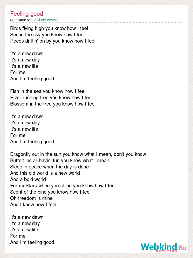 Birds flying high you know how I feel Sun in the sky you know how I feel Reeds driftin' on by you know how I feel It's a new dawn It's a new day It's a new life For me And I'm feeling good Fish in the sea you know how I feel River running free you know how I feel Blossom in the tree you know how I feel It's a new dawn It's a new day It's a new life For me And I'm feeling good Dragonfly out in the sun you know what I mean, don't you know Butterflies all havin' fun you know what I mean Sleep in peace when the day is done And this old world is a new world And a bold world For meStars when you shine you know how I feel Scent of the pine you know how I feel Oh freedom is mine And I know how I feel It's a new dawn It's a new day It's a new life For me And I'm feeling good