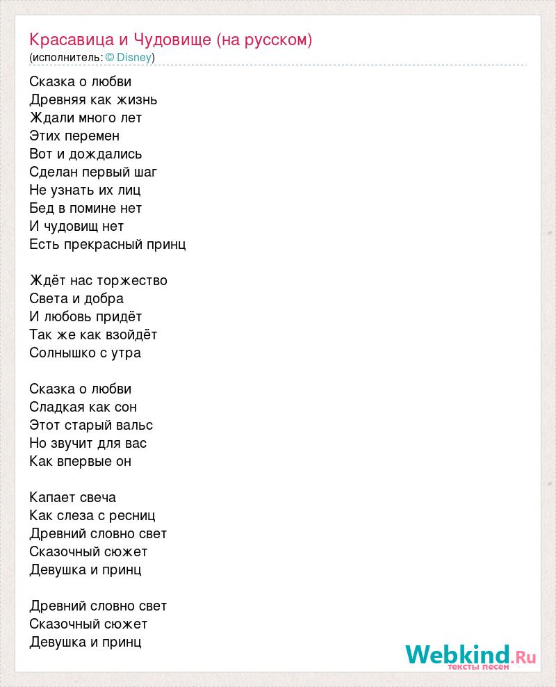 Сказка о любви Древняя как жизнь Ждали много лет Этих перемен Вот и дождались Сделан первый шаг Не узнать их лиц Бед в помине нет И чудовищ нет Есть прекрасный принц Ждёт нас торжество Света и добра И любовь придёт Так же как взойдёт Солнышко с утра Сказка о любви Сладкая как сон Этот старый вальс Но звучит для вас Как впервые он Капает свеча Как слеза с ресниц Древний словно свет Сказочный сюжет Девушка и принц Древний словно свет Сказочный сюжет Девушка и принц