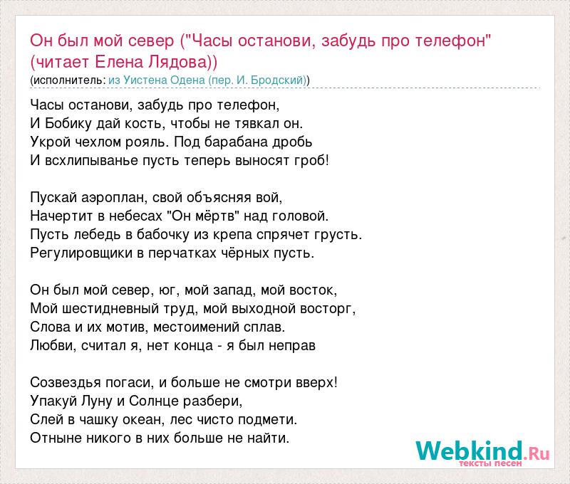 Главная→Исполнители→Из Уистена Одена (пер. И. Бродский)→Он был мой север ("Часы останови, забудь про телефон" (читает Елена Ляд