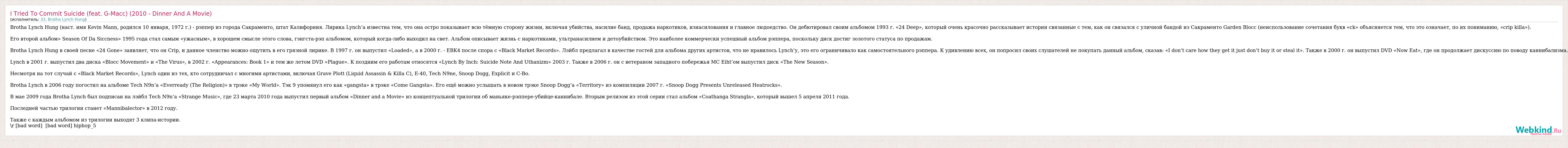 Главная→Исполнители→33. Brotha Lynch Hung→I Tried To Commit Suicide (feat. G-Macc) (2010 - Dinner And A Movie)