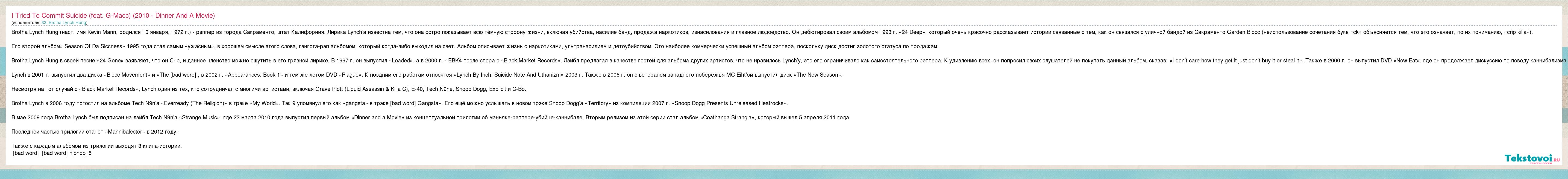 Главная→Исполнители→33. Brotha Lynch Hung→I Tried To Commit Suicide (feat. G-Macc) (2010 - Dinner And A Movie)