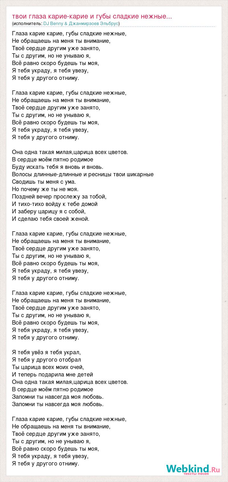Глаза карие карие, губы сладкие нежные, Не обращаешь на меня ты внимание, Твоё сердце другим уже занято, Ты с другим, но не унываю я, Всё равно скоро будешь ты моя, Я тебя украду, я тебя увезу, Я тебя у другого отниму. Глаза карие карие, губы сладкие нежные, Не обращаешь на меня ты внимание, Твоё сердце другим уже занято, Ты с другим, но не унываю я, Всё равно скоро будешь ты моя, Я тебя украду, я тебя увезу, Я тебя у другого отниму. Она одна такая милая,царица всех цветов. В сердце моём пятно родимое Буду искать тебя я вновь и вновь. Волосы длинные-длинные и ресницы твои шикарные Сводишь ты меня с ума. Но почему же ты не моя. Поздней вечер прослежу за тобой, И тихо-тихо войду к тебе домой И заберу царицу я с собой, И сделаю тебя своей женой. Глаза карие карие, губы сладкие нежные, Не обращаешь на меня ты внимание, Твоё сердце другим уже занято, Ты с другим, но не унываю я, Всё равно скоро будешь ты моя, Я тебя украду, я тебя увезу, Я тебя у другого отниму. Глаза карие карие, губы сладкие нежные, Не обращаешь на меня ты внимание, Твоё сердце другим уже занято, Ты с другим, но не унываю я, Всё равно скоро будешь ты моя, Я тебя украду, я тебя увезу, Я тебя у другого отниму. Я тебя увёз я тебя украл, Я тебя у другого отобрал Ты царица всех моих очей, И теперь подарила мне детей Она одна такая милая,царица всех цветов. В сердце моём пятно родимое Запомни ты навсегда моя любовь. Запомни ты навсегда моя любовь. Глаза карие карие, губы сладкие нежные, Не обращаешь на меня ты внимание, Твоё сердце другим уже занято, Ты с другим, но не унываю я, Всё равно скоро будешь ты моя, Я тебя украду, я тебя увезу, Я тебя у другого отниму.