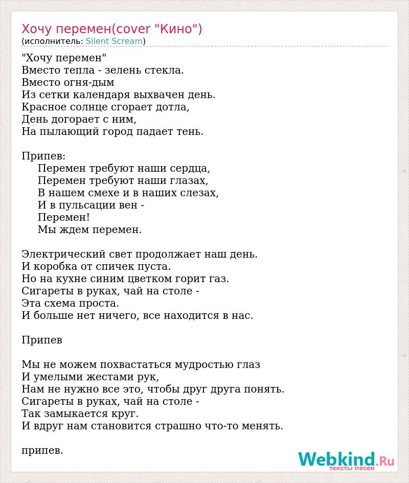 А как ты думаешь, о чем песня "Хочу перемен(cover "Кино")" ?