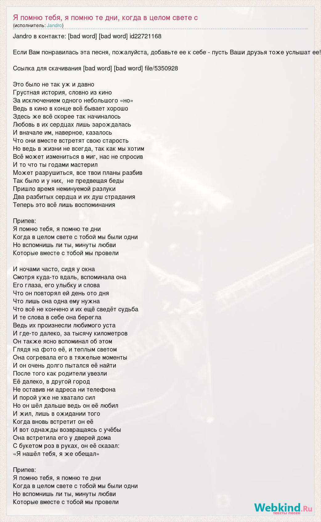 Jandro в контакте: [bad word] [bad word] id22721168 Если Вам понравилась эта песня, пожалуйста, добавьте ее к себе - пусть Ваши друзья тоже услышат ее! Ссылка для скачивания [bad word] [bad word] file/5350928 Это было не так уж и давно Грустная история, словно из кино За исключением одного небольшого «но» Ведь в кино в конце всё бывает хорошо Здесь же всё скорее так начиналось Любовь в их сердцах лишь зарождалась И вначале им, наверное, казалось Что они вместе встретят свою старость Но ведь в жизни не всегда, так как мы хотим Всё может измениться в миг, нас не спросив И то что ты годами мастерил Может разрушиться, все твои планы разбив Так было и у них, не предвещая беды Пришло время неминуемой разлуки Два разбитых сердца и их душ страдания Теперь это всё лишь воспоминания Припев: Я помню тебя, я помню те дни Когда в целом свете с тобой мы были одни Но вспомнишь ли ты, минуты любви Которые вместе с тобой мы провели И ночами часто, сидя у окна Смотря куда-то вдаль, вспоминала она Его глаза, его улыбку и слова Что он повторял ей день ото дня Что лишь она одна ему нужна Что всё не кончено и их ещё сведёт судьба И те слова в себе она берегла Ведь их произнесли любимого уста И где-то далеко, за тысячу километров Он также ясно вспоминал об этом Глядя на фото её, и теплым светом Она согревала его в тяжелые моменты И он очень долго пытался её найти После того как родители увезли Её далеко, в другой город Не оставив ни адреса ни телефона И порой уже не хватало сил Но он шёл дальше ведь он её любил И жил, лишь в ожидании того Когда вновь встретит он её И вот однажды возвращаясь с учёбы Она встретила его у дверей дома С букетом роз в руках, он её сказал: «Я нашёл тебя, я же обещал» Припев: Я помню тебя, я помню те дни Когда в целом свете с тобой мы были одни Но вспомнишь ли ты, минуты любви Которые вместе с тобой мы провели