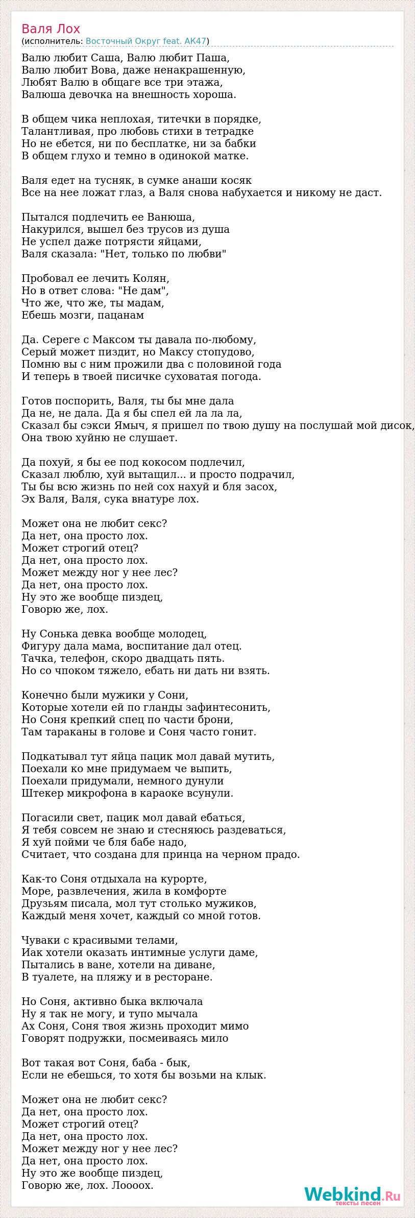 Валю любит Саша, Валю любит Паша, Валю любит Вова, даже ненакрашенную, Любят Валю в общаге все три этажа, Валюша девочка на внешность хороша. В общем чика неплохая, титечки в порядке, Талантливая, про любовь стихи в тетрадке Но не ебется, ни по бесплатке, ни за бабки В общем глухо и темно в одинокой матке. Валя едет на тусняк, в сумке анаши косяк Все на нее ложат глаз, а Валя снова набухается и никому не даст. Пытался подлечить ее Ванюша, Накурился, вышел без трусов из душа Не успел даже потрясти яйцами, Валя сказала: "Нет, только по любви" Пробовал ее лечить Колян, Но в ответ слова: "Не дам", Что же, что же, ты мадам, Ебешь мозги, пацанам Да. Сереге с Максом ты давала по-любому, Серый может пиздит, но Максу стопудово, Помню вы с ним прожили два с половиной года И теперь в твоей писичке суховатая погода. Готов поспорить, Валя, ты бы мне дала Да не, не дала. Да я бы спел ей ла ла ла, Сказал бы сэкси Ямыч, я пришел по твою душу на послушай мой дисок, Она твою хуйню не слушает. Да похуй, я бы ее под кокосом подлечил, Сказал люблю, хуй вытащил... и просто подрачил, Ты бы всю жизнь по ней сох нахуй и бля засох, Эх Валя, Валя, сука внатуре лох. Может она не любит секс? Да нет, она просто лох. Может строгий отец? Да нет, она просто лох. Может между ног у нее лес? Да нет, она просто лох. Ну это же вообще пиздец, Говорю же, лох. Ну Сонька девка вообще молодец, Фигуру дала мама, воспитание дал отец. Тачка, телефон, скоро двадцать пять. Но со чпоком тяжело, ебать ни дать ни взять. Конечно были мужики у Сони, Которые хотели ей по гланды зафинтесонить, Но Соня крепкий спец по части брони, Там тараканы в голове и Соня часто гонит. Подкатывал тут яйца пацик мол давай мутить, Поехали ко мне придумаем че выпить, Поехали придумали, немного дунули Штекер микрофона в караоке всунули. Погасили свет, пацик мол давай ебаться, Я тебя совсем не знаю и стесняюсь раздеваться, Я хуй пойми че бля бабе надо, Считает, что создана для принца на черном прадо. Как-то Соня отдыхала на курорте, Море, развлечения, жила в комфорте Друзьям писала, мол тут столько мужиков, Каждый меня хочет, каждый со мной готов. Чуваки с красивыми телами, Иак хотели оказать интимные услуги даме, Пытались в ване, хотели на диване, В туалете, на пляжу и в ресторане. Но Соня, активно быка включала Ну я так не могу, и тупо мычала Ах Соня, Соня твоя жизнь проходит мимо Говорят подружки, посмеиваясь мило Вот такая вот Соня, баба - бык, Если не ебешься, то хотя бы возьми на клык. Может она не любит секс? Да нет, она просто лох. Может строгий отец? Да нет, она просто лох. Может между ног у нее лес? Да нет, она просто лох. Ну это же вообще пиздец, Говорю же, лох. Лоооох.