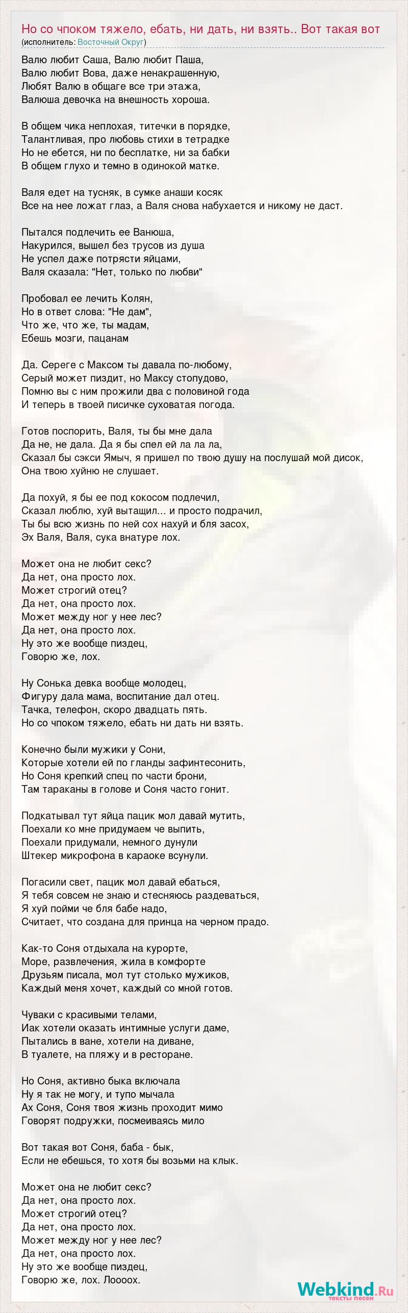 Главная→Исполнители→Восточный Округ→Но со чпоком тяжело, ебать, ни дать, ни взять.. Вот такая вот Соня, баба -