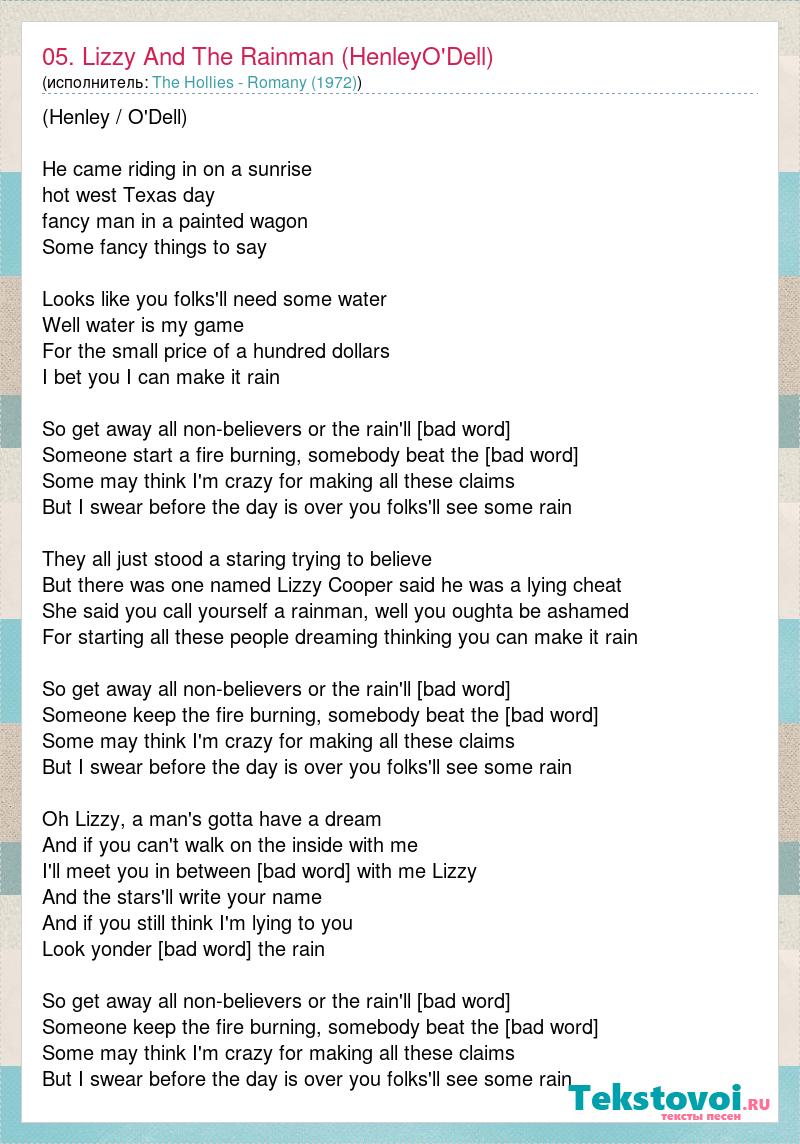 (Henley / O'Dell) He came riding in on a sunrise hot west Texas day fancy man in a painted wagon Some fancy things to say Looks like you folks'll need some water Well water is my game For the small price of a hundred dollars I bet you I can make it rain So get away all non-believers or the rain'll [bad word] Someone start a fire burning, somebody beat the [bad word] Some may think I'm crazy for making all these claims But I swear before the day is over you folks'll see some rain They all just stood a staring trying to believe But there was one named Lizzy Cooper said he was a lying cheat She said you call yourself a rainman, well you oughta be ashamed For starting all these people dreaming thinking you can make it rain So get away all non-believers or the rain'll [bad word] Someone keep the fire burning, somebody beat the [bad word] Some may think I'm crazy for making all these claims But I swear before the day is over you folks'll see some rain Oh Lizzy, a man's gotta have a dream And if you can't walk on the inside with me I'll meet you in between [bad word] with me Lizzy And the stars'll write your name And if you still think I'm lying to you Look yonder [bad word] the rain So get away all non-believers or the rain'll [bad word] Someone keep the fire burning, somebody beat the [bad word] Some may think I'm crazy for making all these claims But I swear before the day is over you folks'll see some rain