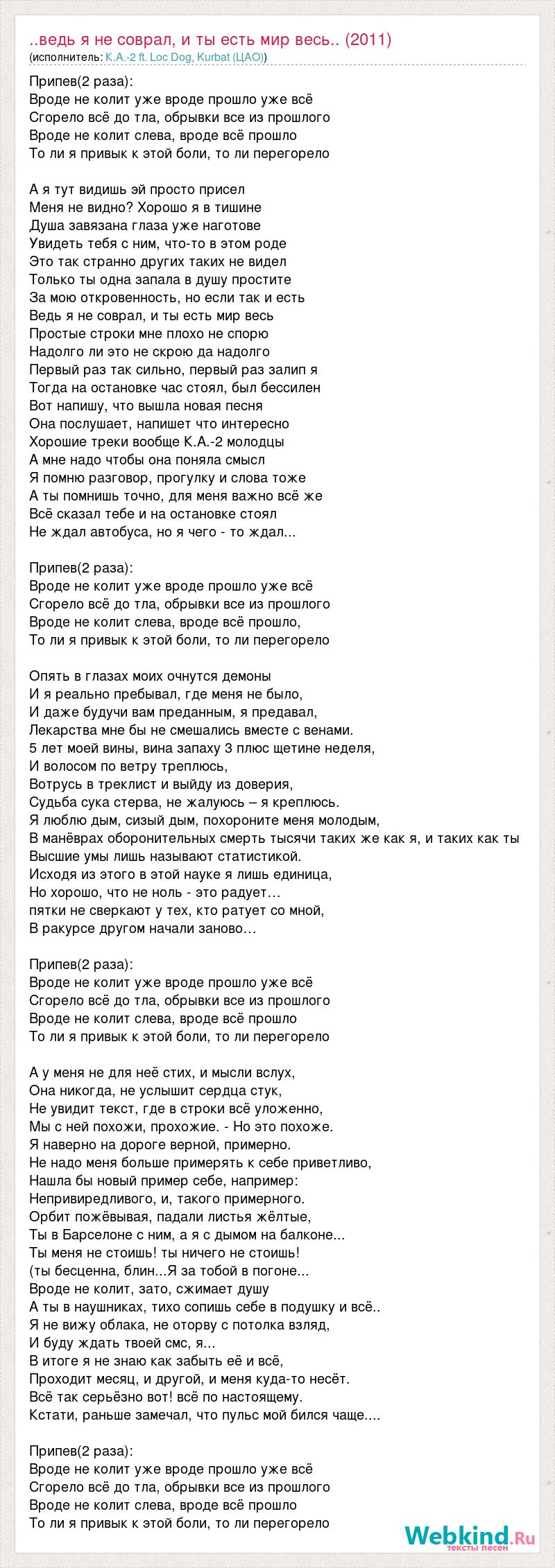 Припев(2 раза): Вроде не колит уже вроде прошло уже всё Сгорело всё до тла, обрывки все из прошлого Вроде не колит слева, вроде всё прошло То ли я привык к этой боли, то ли перегорело А я тут видишь эй просто присел Меня не видно? Хорошо я в тишине Душа завязана глаза уже наготове Увидеть тебя с ним, что-то в этом роде Это так странно других таких не видел Только ты одна запала в душу простите За мою откровенность, но если так и есть Ведь я не соврал, и ты есть мир весь Простые строки мне плохо не спорю Надолго ли это не скрою да надолго Первый раз так сильно, первый раз залип я Тогда на остановке час стоял, был бессилен Вот напишу, что вышла новая песня Она послушает, напишет что интересно Хорошие треки вообще К.А.-2 молодцы А мне надо чтобы она поняла смысл Я помню разговор, прогулку и слова тоже А ты помнишь точно, для меня важно всё же Всё сказал тебе и на остановке стоял Не ждал автобуса, но я чего - то ждал... Припев(2 раза): Вроде не колит уже вроде прошло уже всё Сгорело всё до тла, обрывки все из прошлого Вроде не колит слева, вроде всё прошло, То ли я привык к этой боли, то ли перегорело Опять в глазах моих очнутся демоны И я реально пребывал, где меня не было, И даже будучи вам преданным, я предавал, Лекарства мне бы не смешались вместе с венами. 5 лет моей вины, вина запаху 3 плюс щетине неделя, И волосом по ветру треплюсь, Вотрусь в треклист и выйду из доверия, Судьба сука стерва, не жалуюсь – я креплюсь. Я люблю дым, сизый дым, похороните меня молодым, В манёврах оборонительных смерть тысячи таких же как я, и таких как ты Высшие умы лишь называют статистикой. Исходя из этого в этой науке я лишь единица, Но хорошо, что не ноль - это радует… пятки не сверкают у тех, кто ратует со мной, В ракурсе другом начали заново… Припев(2 раза): Вроде не колит уже вроде прошло уже всё Сгорело всё до тла, обрывки все из прошлого Вроде не колит слева, вроде всё прошло То ли я привык к этой боли, то ли перегорело А у меня не для неё стих, и мысли вслух, Она никогда, не услышит сердца стук, Не увидит текст, где в строки всё уложенно, Мы с ней похожи, прохожие. - Но это похоже. Я наверно на дороге верной, примерно. Не надо меня больше примерять к себе приветливо, Нашла бы новый пример себе, например: Непривиредливого, и, такого примерного. Орбит пожёвывая, падали листья жёлтые, Ты в Барселоне с ним, а я с дымом на балконе... Ты меня не стоишь! ты ничего не стоишь! (ты бесценна, блин...Я за тобой в погоне... Вроде не колит, зато, сжимает душу А ты в наушниках, тихо сопишь себе в подушку и всё.. Я не вижу облака, не оторву с потолка взляд, И буду ждать твоей смс, я... В итоге я не знаю как забыть её и всё, Проходит месяц, и другой, и меня куда-то несёт. Всё так серьёзно вот! всё по настоящему. Кстати, раньше замечал, что пульс мой бился чаще.... Припев(2 раза): Вроде не колит уже вроде прошло уже всё Сгорело всё до тла, обрывки все из прошлого Вроде не колит слева, вроде всё прошло То ли я привык к этой боли, то ли перегорело