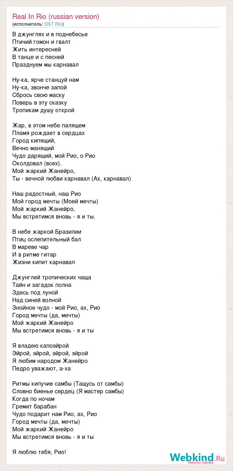 В джунглях и в поднебесье Птичий гомон и гвалт Жить интересней В танце и с песней Празднуем мы карнавал Ну-ка, ярче станцуй нам Ну-ка, звонче запой Сбрось свою маску Поверь в эту сказку Тропикам душу открой Жар, в этом небе палящем Пламя рождает в сердцах Город кипящий, Вечно манящий Чудо дарящий, мой Рио, о Рио Околдовал (всех). Мой жаркий Жанейро, Ты - вечной любви карнавал (Ах, карнавал) Наш радостный, наш Рио Мой город мечты (Моей мечты) Мой жаркий Жанейро, Мы встретимся вновь - я и ты. В небе жаркой Бразилии Птиц ослепительный бал В мареве чар И в ритме гитар Жизни кипит карнавал Джунглей тропических чаща Тайн и загадок полна Здесь под луной Над синей волной Знойное чудо - мой Рио, ах, Рио Город мечты (да, мечты) Мой жаркий Жанейро Мы встретимся вновь - я и ты Я владею капоэйрой Эйрой, эйрой, эйрой, эйрой Я любим народом Жанейро Педро уважают, а-ха Ритмы кипучие самбы (Тащусь от самбы) Словно биенье сердец (Я мастер самбы) Когда по ночам Гремит барабан Чудо подарит нам Рио, ах, Рио Город мечты (да, мечты) Мой жаркий Жанейро Мы встретимся вновь - я и ты Я люблю тебя, Рио!